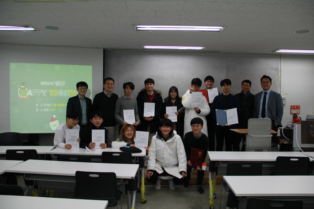 2018학년도 2학기 건환공 Happy Together - 일시: 2018년 12월 11일 (화) 17:00-19:00 - 장소: 35동 316호 - 프로그램: 학부 졸업논문발표회 포스터 시상 및 발표, 건설환경스마트시티 경진대회 시상 및 발표 제3회 창의상 경진대회 시상, 송년회