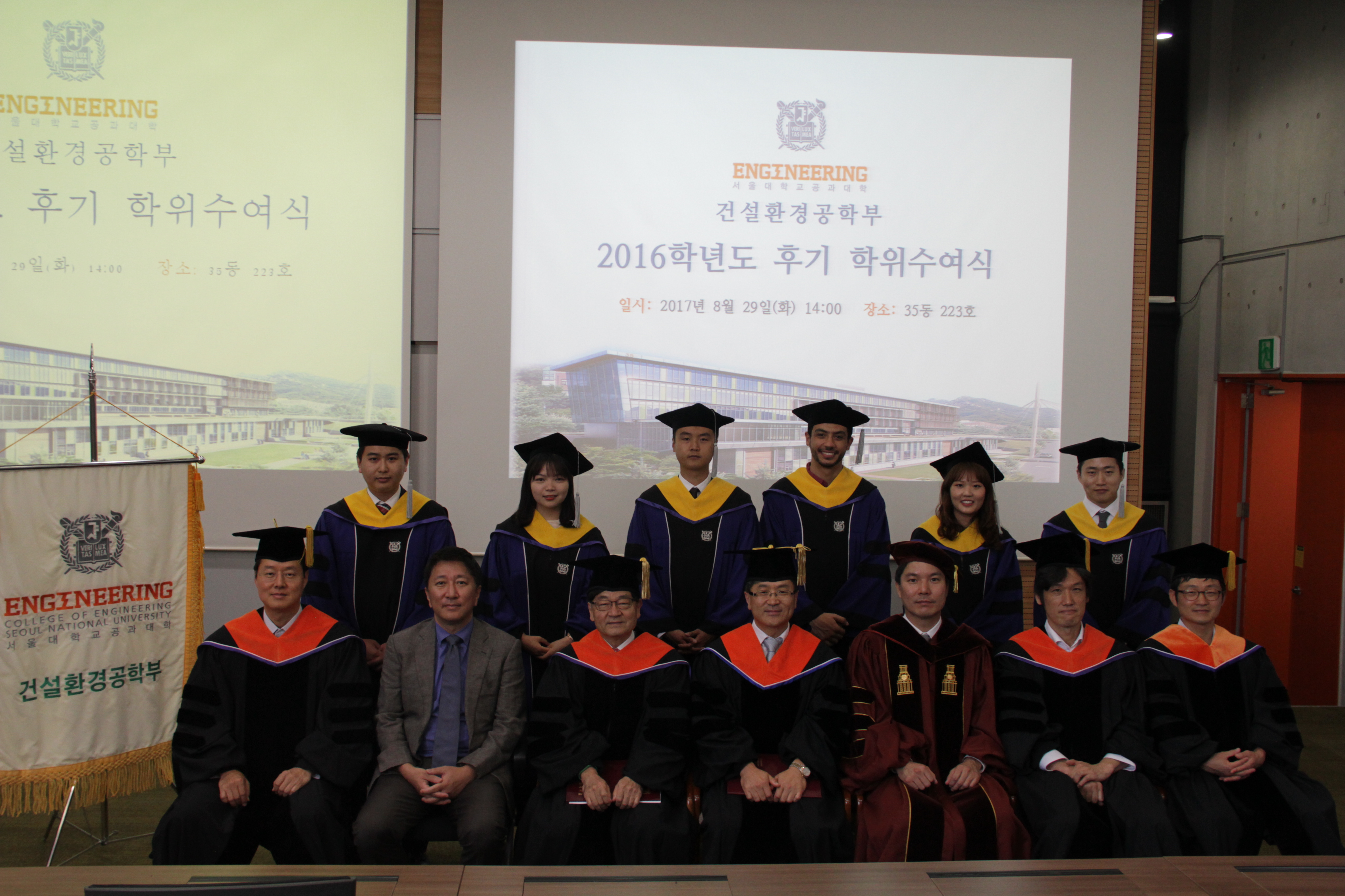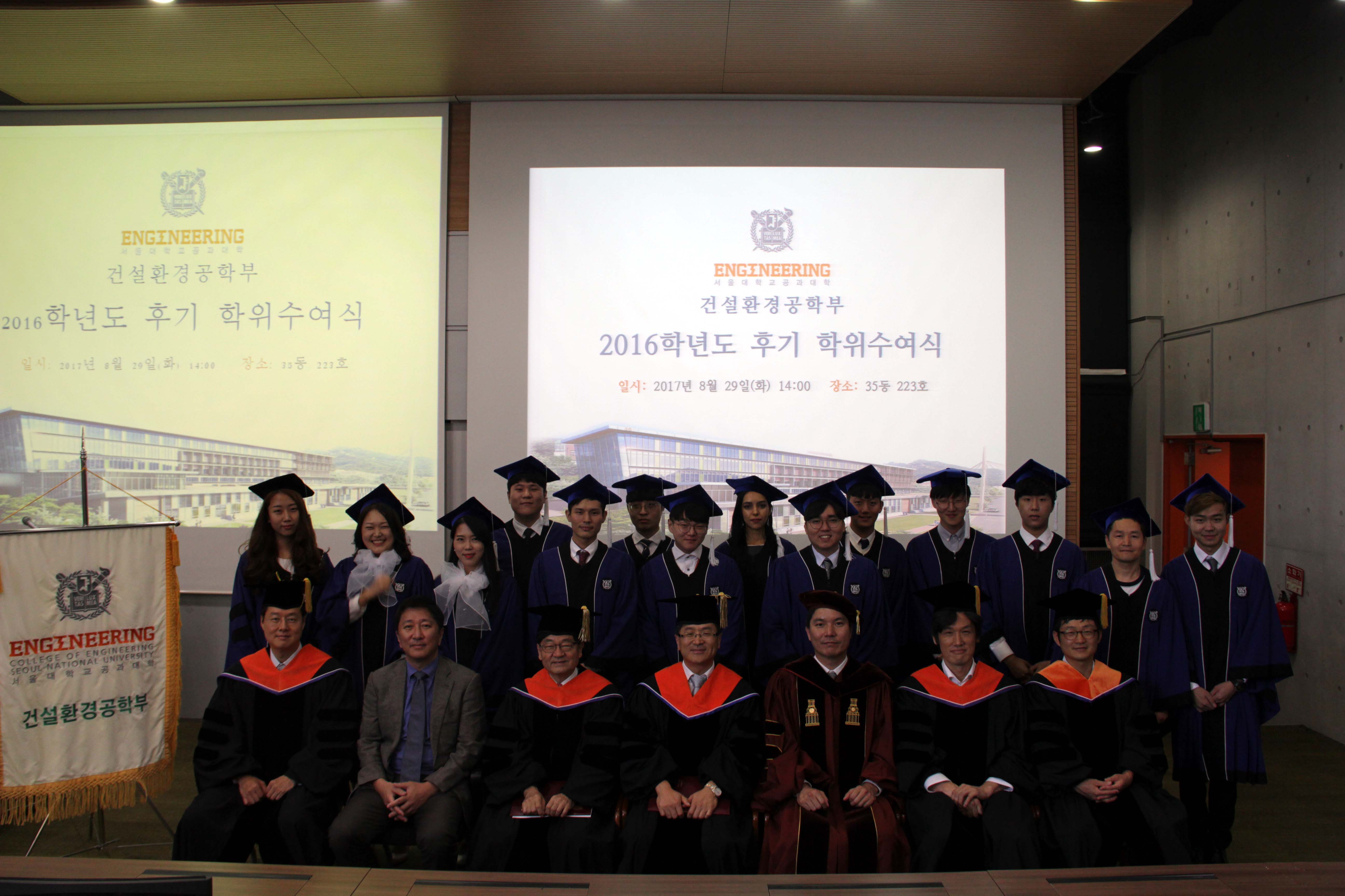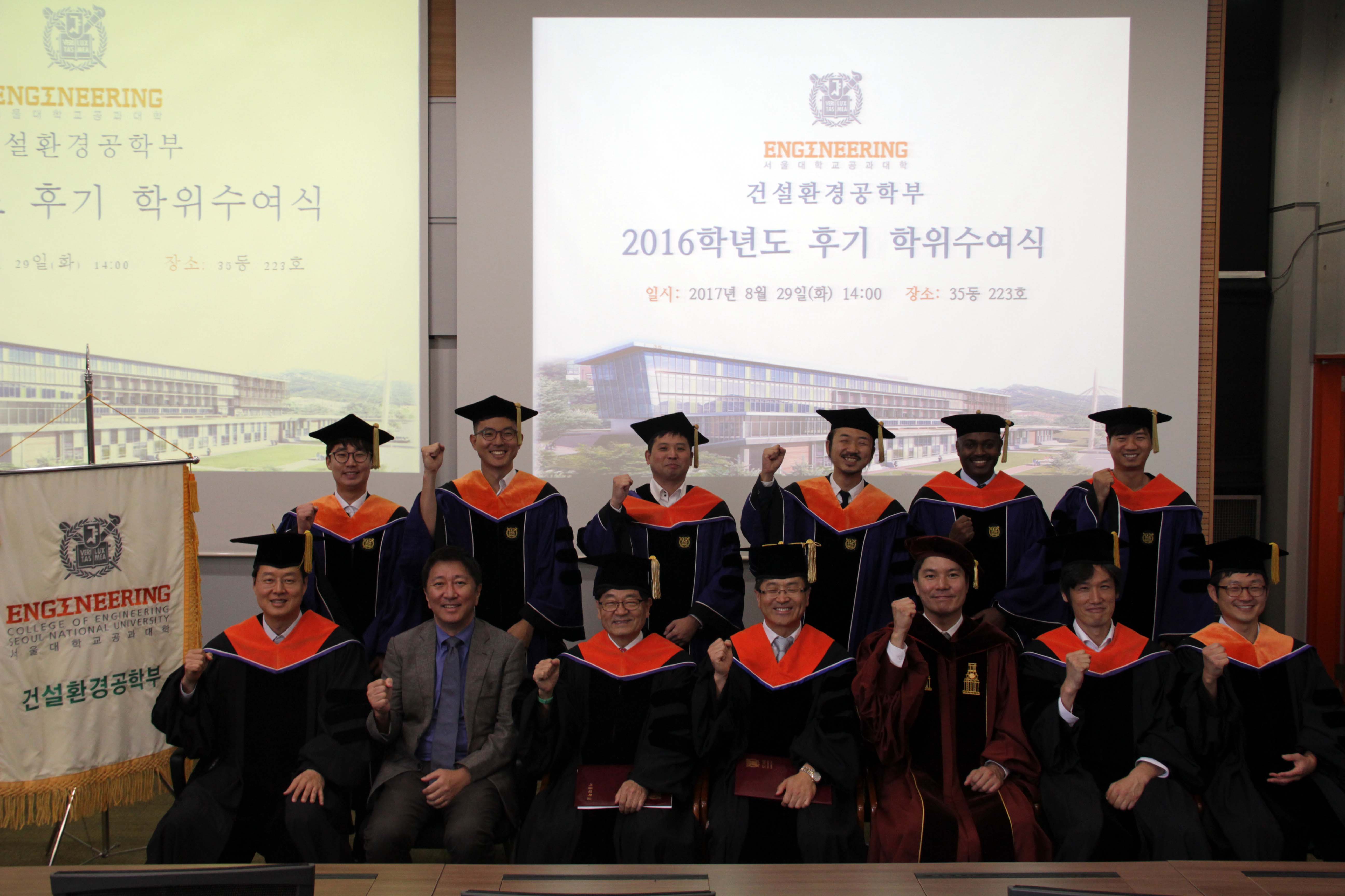 2016학년도 후기 학위수여식 8월 29일 오후 2시 35동 223호에서 2016학년도 후기 학위수여식을 개최하였다. 김영오 학생부학부장의 사회로 김호경 건설환경공학부장의 인사말과 신현목 토목동창회장의 축사에 이어 학위를 수여하는 순서로 진행되었다. 이번 학기에는 학사 19명, 석사 8명, 박사 10명이 배출되었으며 가족과 친지, 선・후배가 함께 참석하여 축하하였다. 건설환경공학부는 앞으로도 매학기 학위수여식을 개최하여 학생들의 졸업을 축하하고, 새로운 시작을 격려하는 자리를 마련할 예정이다. 학위수여자 명단 박사 (10명) 곽윤철(09), 김도빈(11), 김선중(12), 민근홍(08), 박호철(11), 오정은(05), 오지희(12), 타텍(14), 하승현(11), 황재민(10) 석사 (8명) 슈에브(15), 우동준15(), 이상호(15), 이재성(15), 이창민(15), 정요훈()15, 정지현(15), 채인영(15) 학사 (19명) 강욱(10), 곽병철(09), 김광중(11), 김미리(12), 문창욱(11), 박성현(09), 소비쳇(13), 신경택(08), 알리레자(13), 우관수(11), 우메이마(12), 윤정현(08), 이정아(12), 이창희(12), 임현홍(11), 정태호(11), 조강준(10), 최성은(12), 최영훈(11)
