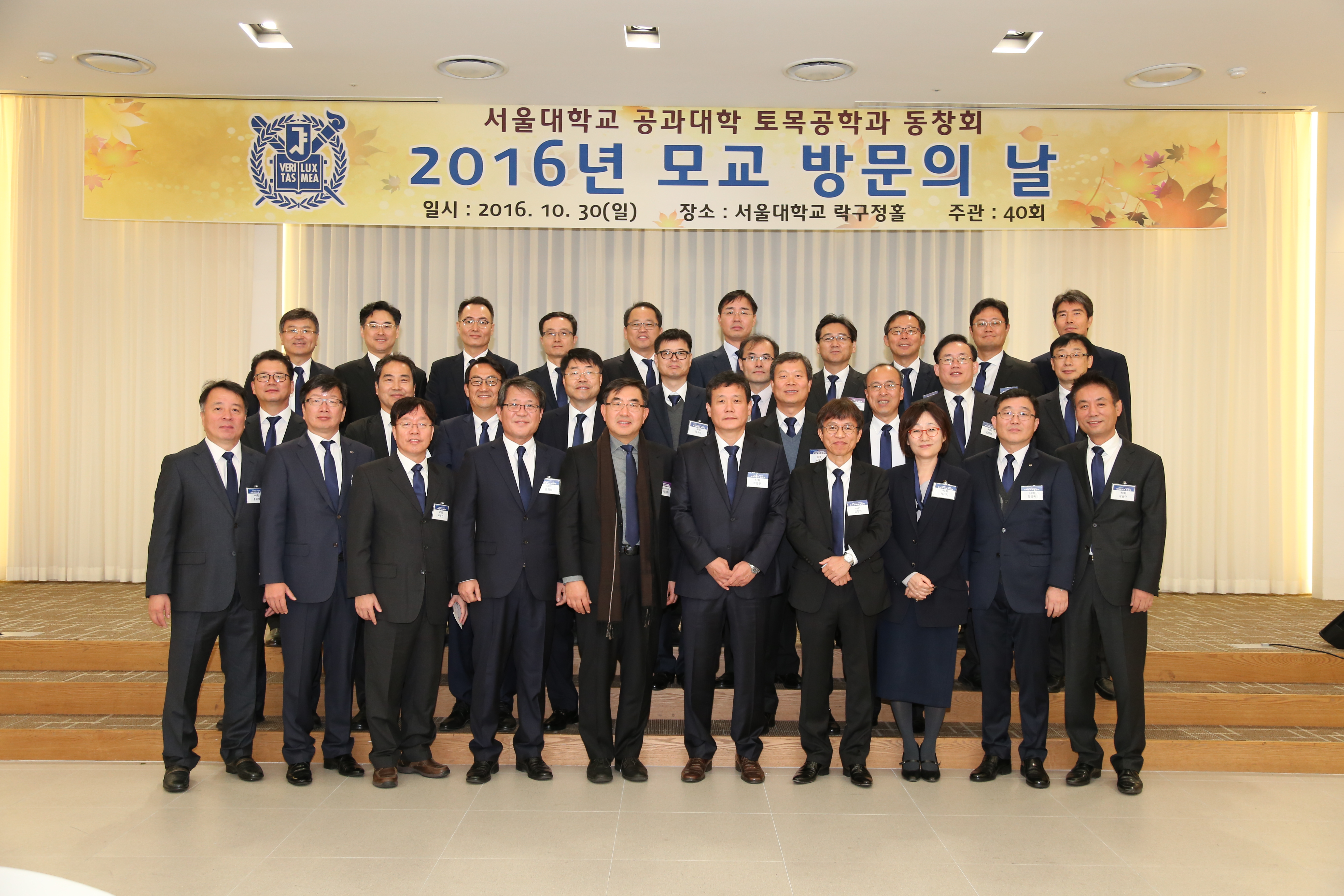 토목동창회 모교방문의 날 행사 참여 서울대학교 토목동창회는 10월 30일 서울대학교 38동 락구정에서 2016년 모교방문의 날을 개최하였다. 김대하 동창회장(28회, 동일기술공사 부회장)의 인사말을 시작으로 2016 자랑스러운 올해의 동문상 및 해외건설인상 시상, 동기회 및 한만엽 장학금 수여, 원로동문 감사선물 증정, 건설환경공학부장 인사 및 모교소식 보고 순서로 진행되었다. '웃음으로 더 행복한 세상 바라보기' 특별강연을 들은 후 점심식사 시간을 가졌고 이어 모두 함께 레크리에이션에 참여하였다. 마지막으로 경품 추첨을 끝으로 행사는 마무리되었다. 동문과 함께 참석한 가족들 모두의 높은 관심과 호응 속에서 두터운 친목을 다지는 시간이 되었다. 장학금 수여 및 수상 내역 동기회 장학금 : 조강준 (건설환경공학부 10), 이재현 (건설환경공학부 09) 한만엽 장학금 : 최원석 (건설환경공학부 12) 2016 자랑스러운 올해의 동문상 이상복 (31회, 대저건설 대표이사), 김우종 (36회, DM엔지니어링 대표이사) 박창근 (38회, 대한하천학회장), 심만석 (38회, 바우컨설턴트 대표이사) 2016 자랑스러운 해외건설인 상 편도권 (12회, 前 ㈜유신코퍼레이션 부회장)
