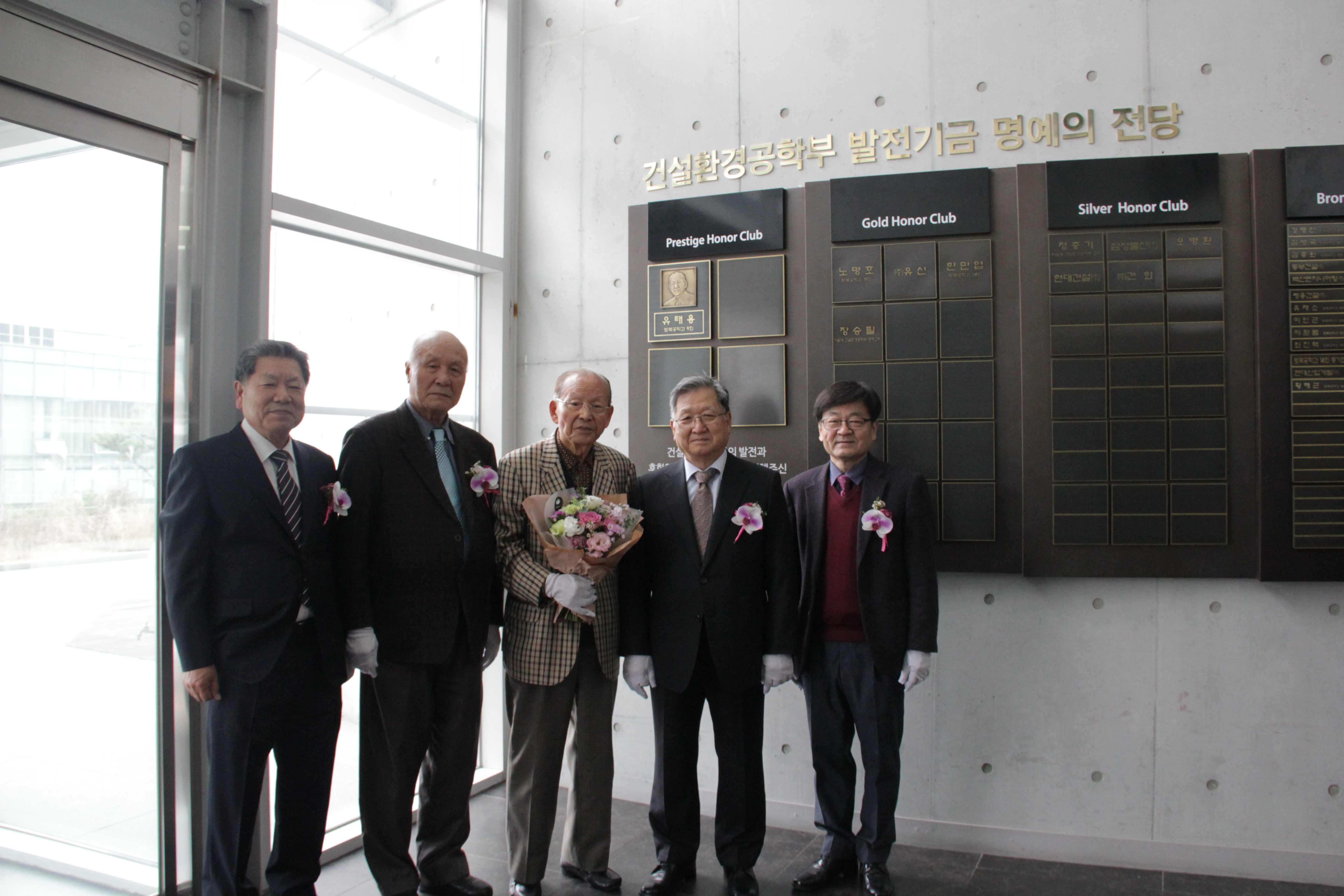 명예의 전당 제막식 11월 21일 35동 로비에서 건설환경공학부 발전기금 명예의 전당 제막식을 가졌다. 올 해 명예의 전당 Prestige Honor Club에 등재된 유태용 기부자를 비롯하여 건설환경공학부 김호경 학부장, 박중현, 선우중호 명예교수, 토목동창회 김대하 회장, 신현목 동문 등 주요 귀빈이 참석한 가운데 진행되었다. 건설환경공학부는 지난 2015년부터 우리 학부의 발전을 위한 기금출연자에 대한 예우로서 존경과 감사의 마음을 담아 출연자 성명을 건설환경공학부 로비 벽면 명예의 전당에 영구 보존하고 있다. 서울대학교 발전기금과 공과대학 연구재단을 통하여 건설환경공학부에 기금을 출연한 기부자는 출연금 총액에 따라 100만원 이상 Honor Club, 1천만원 이상 Bronze Honor Club, 5천만원 이상 Silver Honor Club, 1억원 이상 Gold Honor Club, 5억원 이상 Prestige Honor Club에 성명을 올리게 된다.