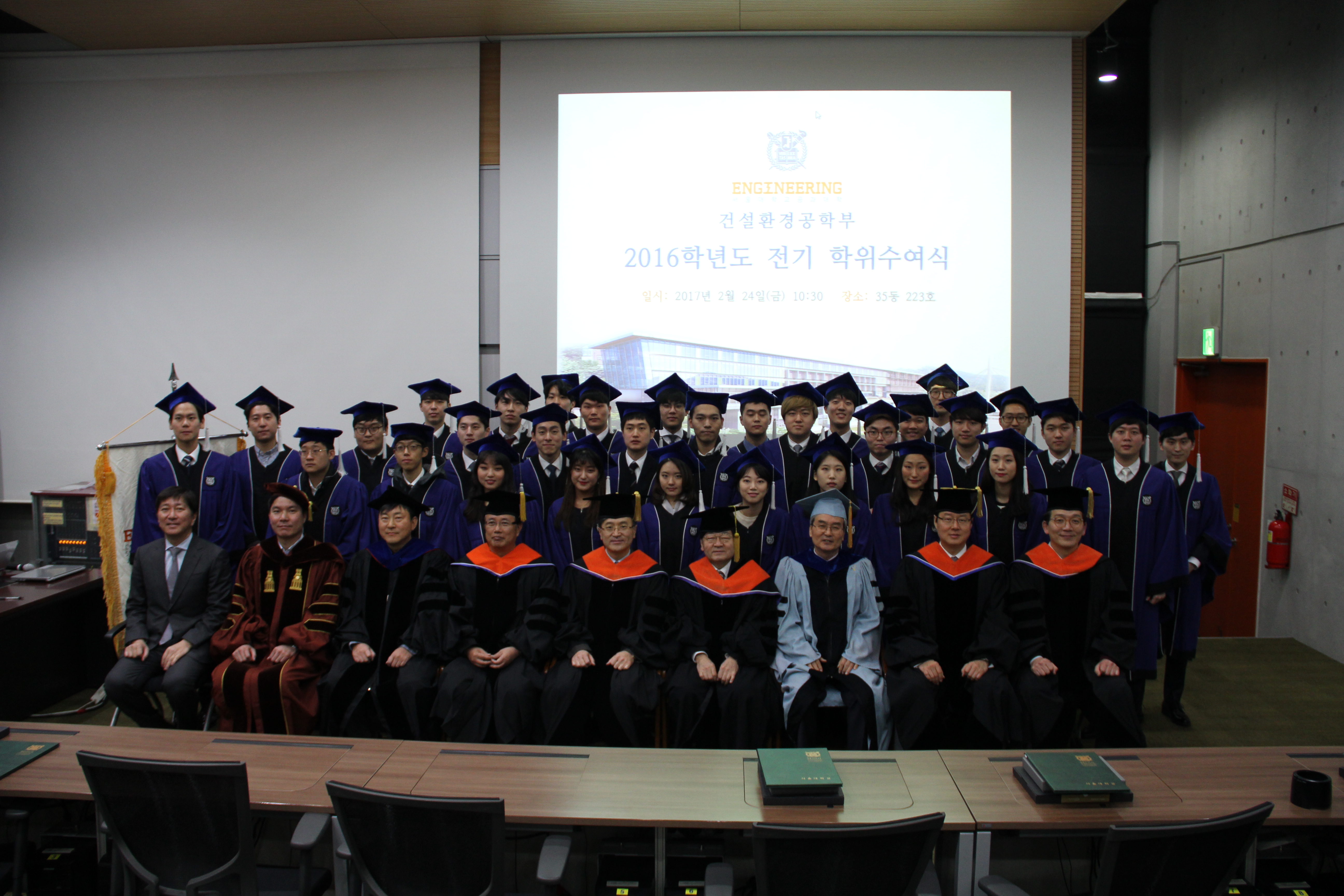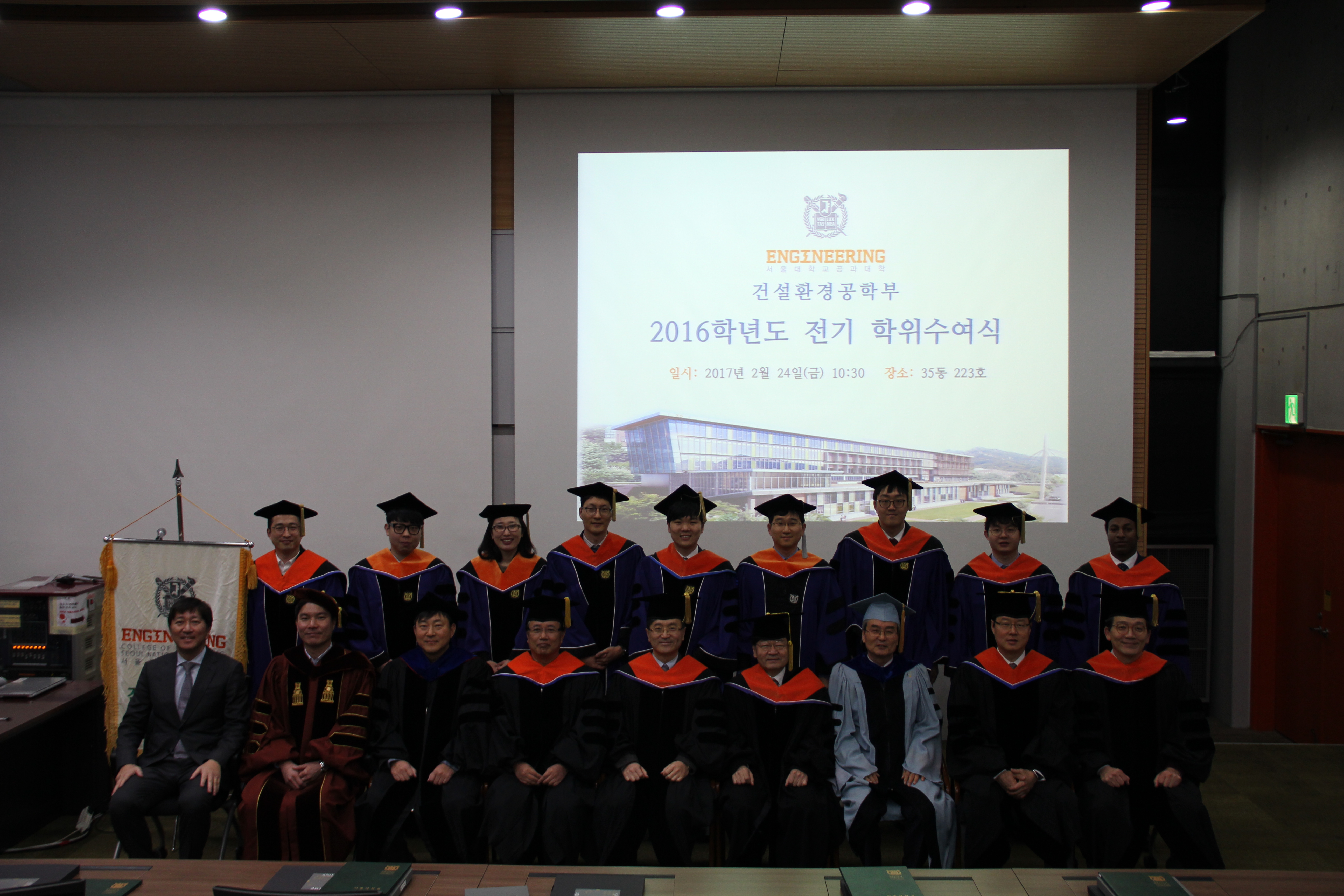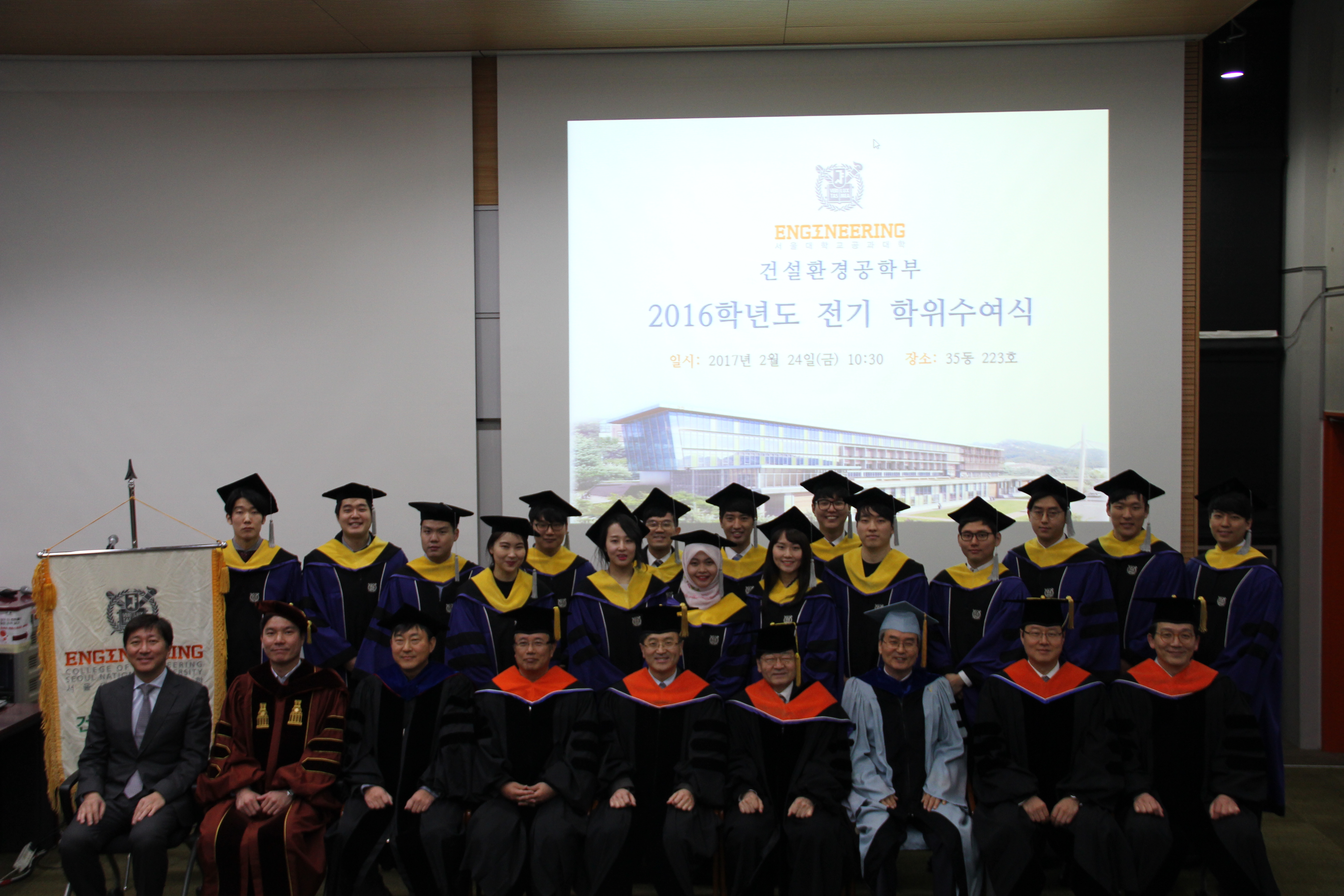 2016학년도 전기 학위수여식 2월 24일 오후 10시 30분 35동 223호에서 2016학년도 전기 학위수여식을 개최하였다. 김영오 학생부학부장의 사회로 김호경 건설환경공학부장의 인사말과 신현목 토목동창회장의 축사에 이어 학위를 수여하는 순서로 진행되었다. 이번 학기에는 학사 37명, 석사 20명, 박사 17명이 배출되었으며 가족과 친지, 선・후배가 함께 참석하여 축하하였다. 건설환경공학부는 매학기 학위수여식을 개최하여 학생들의 졸업을 축하하고, 새로운 시작을 격려하는 자리를 마련하고 있다. <학위수여자 명단> 박사 (17명) 이두한(07), 신현진(08), 이경민(08), 박상근(09), 윤혜진(09), 유지현(10), 최황정(10), 박자민(11), 최현석(11), 조흠(11), 고성진(12), 박인환(12), 이지운(12), 천세현(12), 권락용(12), 게타츄(13), 엔규엔(13) 석사 (20명) 최길호(12), 백승열(14), 정서연(14), 김경태(15), 김정래(15), 김태용(15), 김택상(15), 남기도(15), 박정환(15), 박주영(15), 박지혜(15), 백윤지(15), 송민석(15), 심인태(15), 안재홍(15), 이상협(15), 조범희(15), 천휘경(15), 최병성(15), 세라드위(15) 학사 (37명) 권용진(08), 김동억(08), 박지윤(08), 송준혁(08), 윤영진(08), 이종우(08), 김 빈(09), 남경식(09), 안영노(09), 이정식(09), 민경준(10), 이우람(10), 이준희(10), 장고운(10), 곽성진(11), 김민규(11), 김지훈(11), 노선영(11), 신한결(11), 전인형(11), 주권호(11), 최의현(11), 김나연(12), 박시진(12), 유현종(12), 김민호(12), 김민영(13), 박현우(13), 부예은(13), 송상원(13), 양제윤(13), 유승민(13), 유호정(13), 전우현(13), 정병준(13), 한지수(13), 정준영(13) <대한토목회 표창> 전인형(11) <최우등> 전학년 평점평균 3.9이상 전인형(11), 남경식(09), 한지수(13) <우등> 전학년 평점평균 3.6이상 3.9미만 유승민(13), 이우람(10), 윤영진(08), 부예은(13), 김민규(11), 김지훈(11), 최의현(11), 유호정(13), 이정식(09), 이종우(08), 양제윤(13)