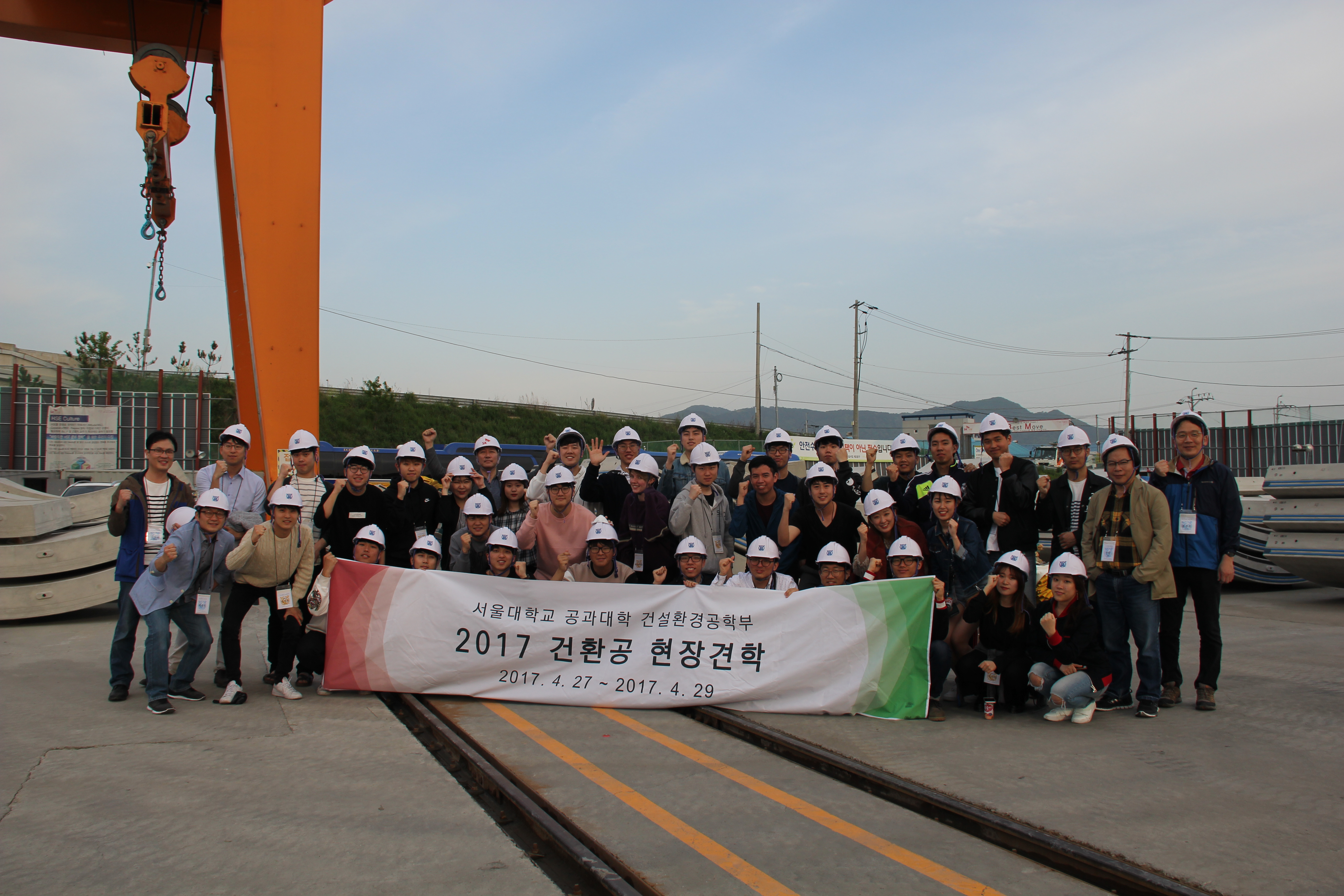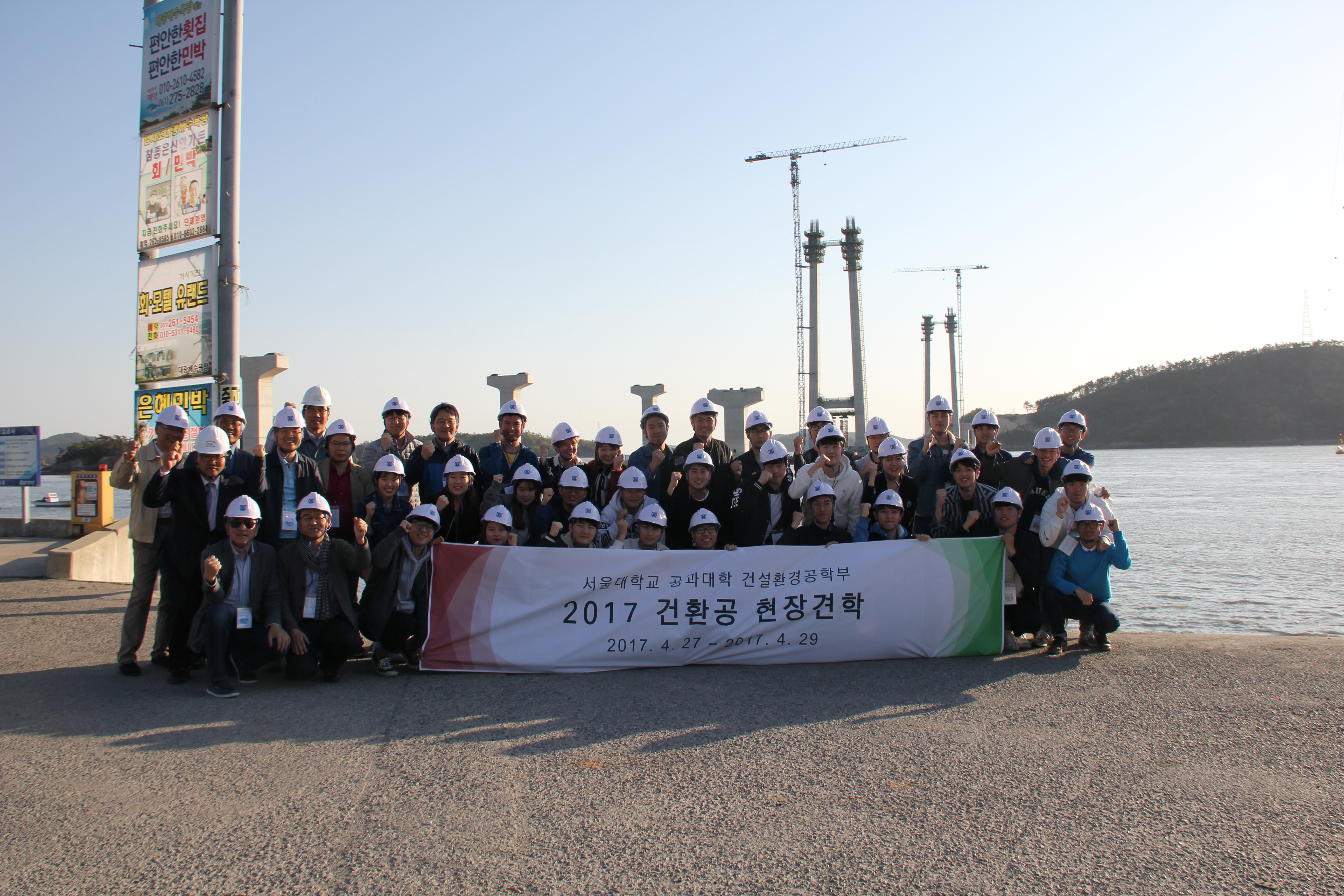 2017 현장견학 4월 27일~ 4월 29일 2박 3일간 건설환경공학부 3,4 학년 학부생들이 현장견학을 다녀왔다. 총 41명(학부생 32명, 교수 8명, 직원 1명)이 현장견학에 참가하여 전남 신안군 지도-임자도 도로 건설현장, 거가대교 홍보관, 부산 김해복선전철(부전-마산)터널 건설 현장을 방문하였다. 첫째날 서울대학교를 출발하여 전남 신안군 지도-임자도 도로 건설현장에 도착하여 건설공사 개요에 대한 시공사의 안내와 연육교 풍동실험에 대한 김호경 교수의 설명을 들은 후 현장을 견학하였다. 이 현장은 평면 2차로의 사장교, 현수교로 시공되며 주민과 관광객들의 이동 불편 해소에 크게 기여할 것으로 기대된다. 둘째날 숙소인 엘도라도 리조트를 출발하여 거가대교 홍보전시관으로 이동하였다. 세계 최대 수심 해저터널 연결도로인 거가대료 홍보전시관을 관람 후 김해복선전철(부전-마산) 터널 건설 현장에 도착하였다. 부산광역시 부전동에서 시작되어 경남 김해시 신안리 일대까지 이어지는 이 사업은 2020년에 개통되며 지역간 이동시간을 1시간 33분에서 38분으로 줄일 것으로 예상된다. 짧은 여정이었지만 여러 현장을 통해 학교에서 이론으로 접했던 내용을 현장에서 직접 체험하고, 현장 직원들의 생생한 경험을 직접 들을 수 있는 소중한 시간이 되었다. 또한 현장에 진출해있는 선배들의 조언은 졸업 후 진로에 대한 고민을 하고 있는 3,4 학년들에게 구체적인 도움이 되었고, 참가한 교수들과의 자유로운 토론을 통하여 관심 분야에 대한 깊이 있는 이해와 안목을 갖추는 계기가 되었다.