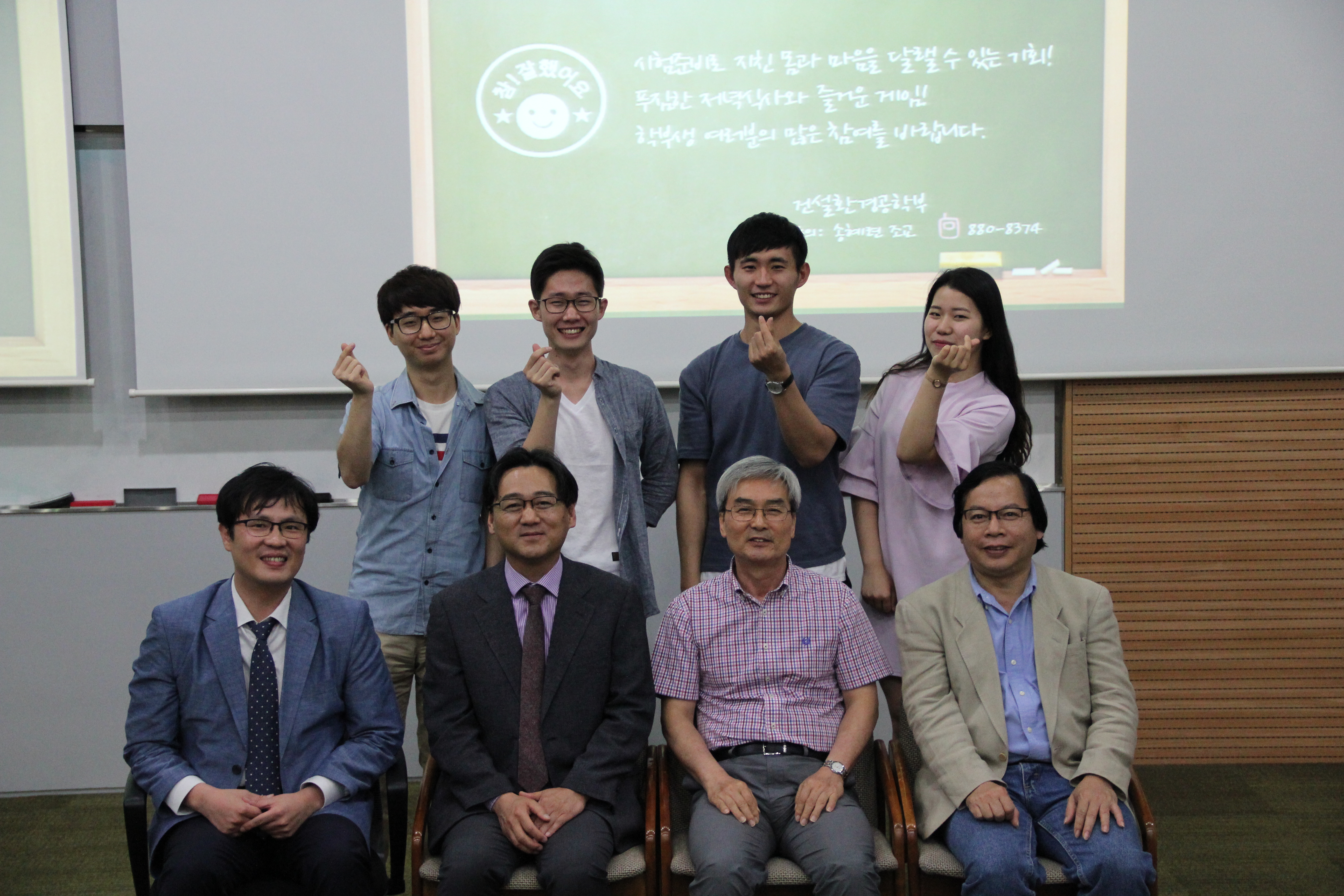 69일 오후 530분부터 35223호에서 2016학년도 1학기 건환공 Happy Together를 개최하였다. 행사는 이청원 교무부학부장 인사, 학생회장단 인사에 이어 학부 졸업 논문 발표회, 학생 포트폴리오 경진대회 시상 및 수상자 발표순으로 진행 되었다. 행사가 끝난 후 함께 저녁식사를 나누며 건설환경공학부의 구성원 모두가 그동안 쌓인 긴장을 풀고 서로의 노고에 대해 격려하는 뜻 깊은 자리가 되었다.