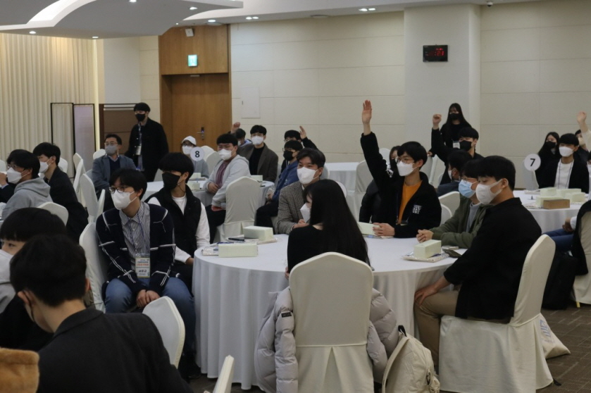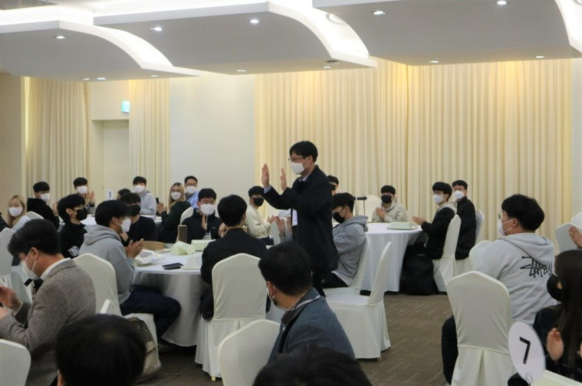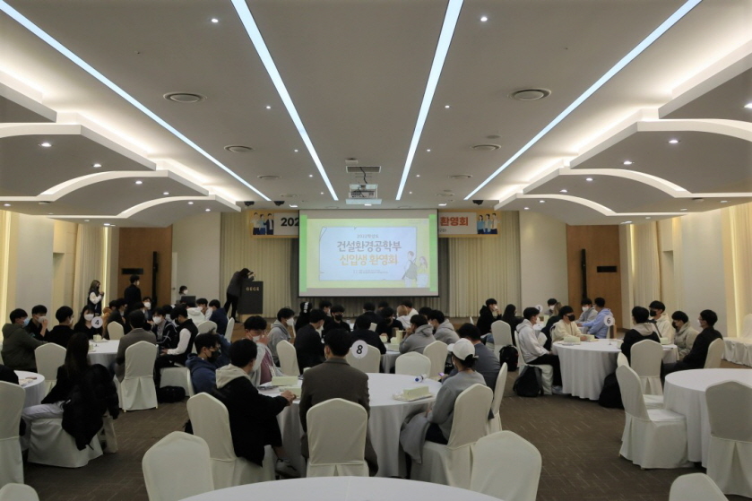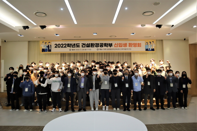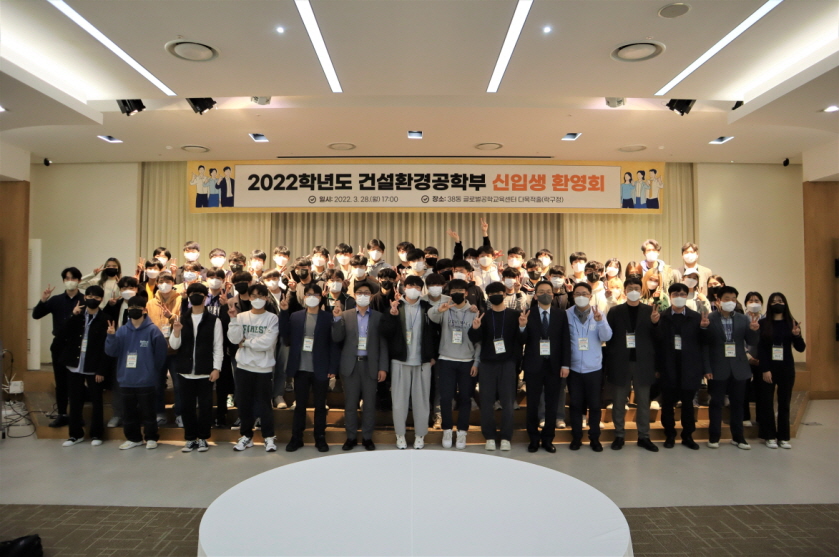 3월 28일 오후 5시 글로벌 공학교육센터 다목적 홀에서 2022학년도 건설환경공학부 신입생 환영회가 열렸다. 22학번 학부 신입생과 재학생, 교수, 직원 등 70여명이 참석한 가운데 행사 전 문진표 작성과 체온 측정, 행사장 내 마스크 착용 등의 방역수칙을 철저히 준수하여 진행하였다.