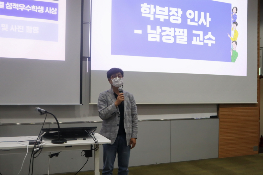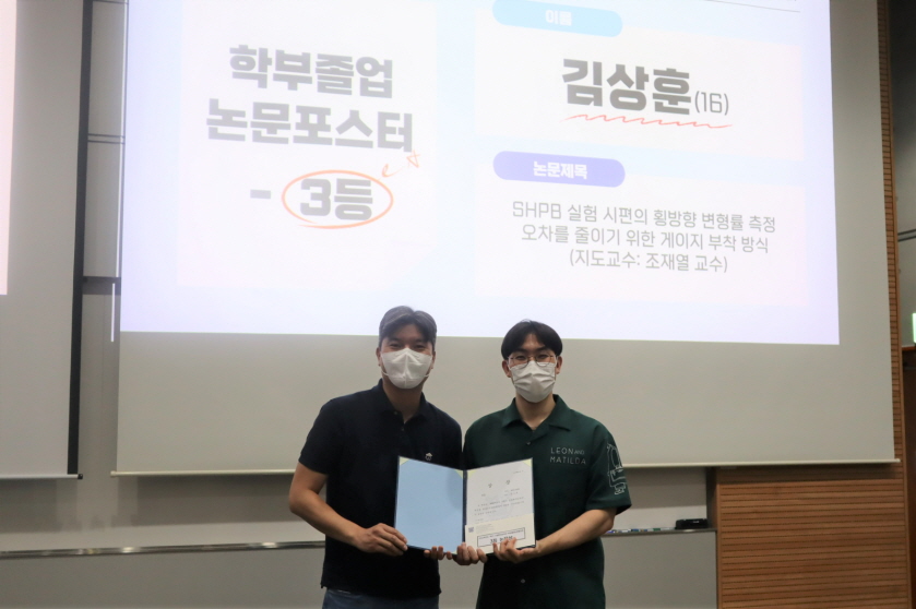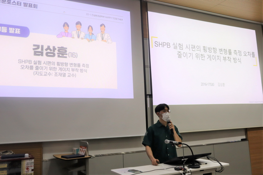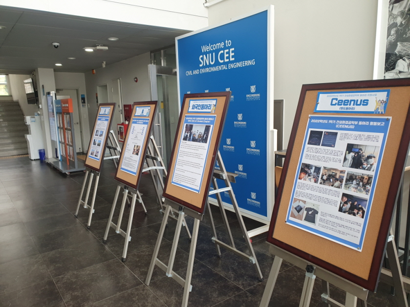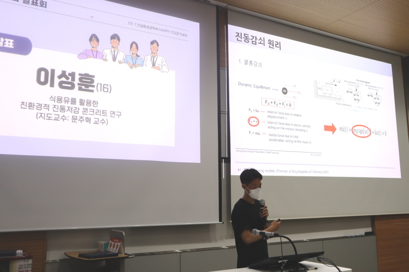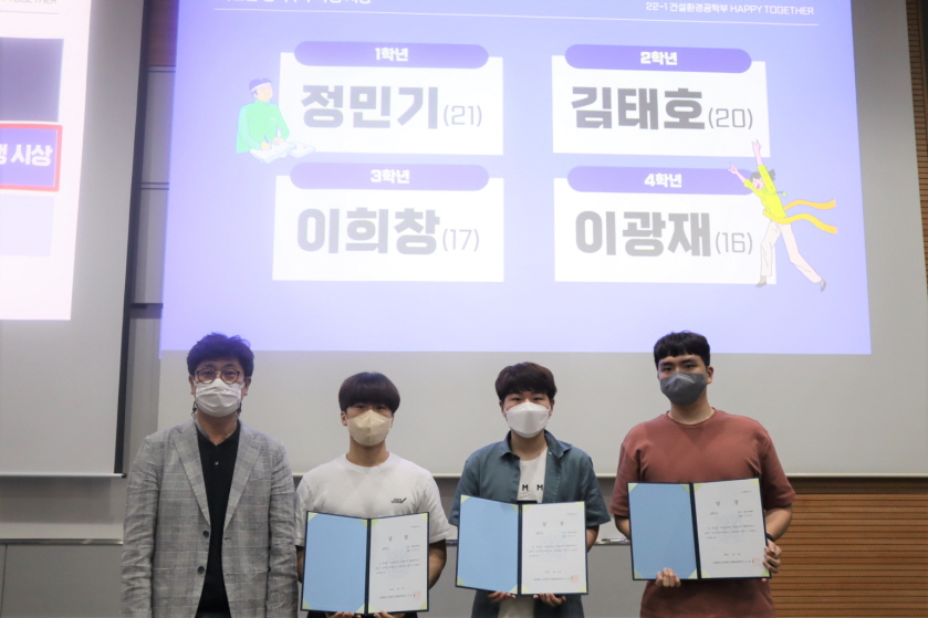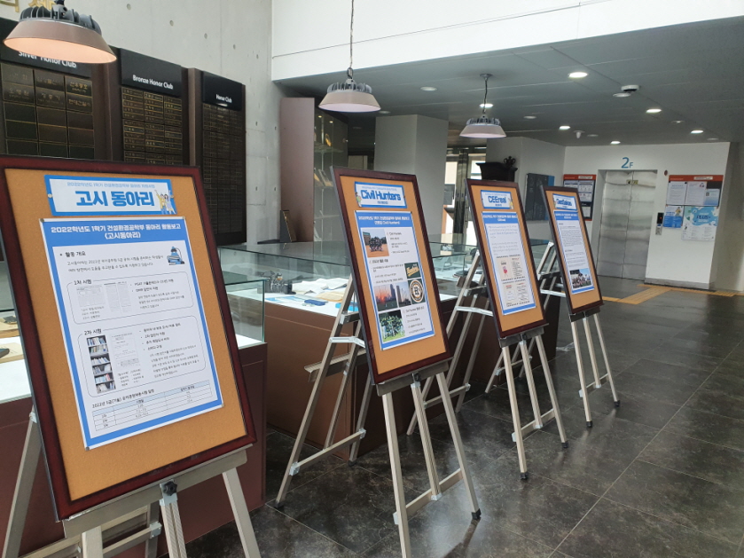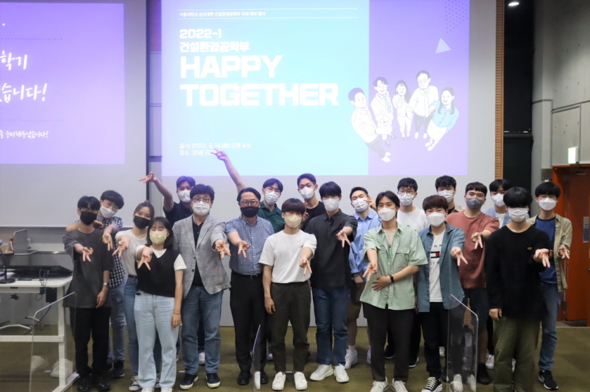 [2022학년도 1학기 건설환경공학부 Happy Together] 2022년 6월 14일 오후 4시부터 35동 223호에서 2022학년도 1학기 건환공 Happy Together를 개최하였다. 실내에서 진행되는 행사이므로 행사 참석자 전원 모두 마스크를 착용하여 행사를 진행하였다. 행사는 류예린 학생회장의 사회로 남경필 학부장의 인사에 이어 학부 졸업 논문 발표회, 학생 포트폴리오 경진대회 시상 및 수상자 발표, 학년별 성적 우수학생 시상 순서로 진행되었다. 또한, 한 학기동안 진행한 7개의 동아리(융, 지오싸커스, 씨너스, 씨리얼, 고시동아리, 시빌헌터스, 외국인동아리) 활동 보고가 35동 2층 로비에서 진행되었다.