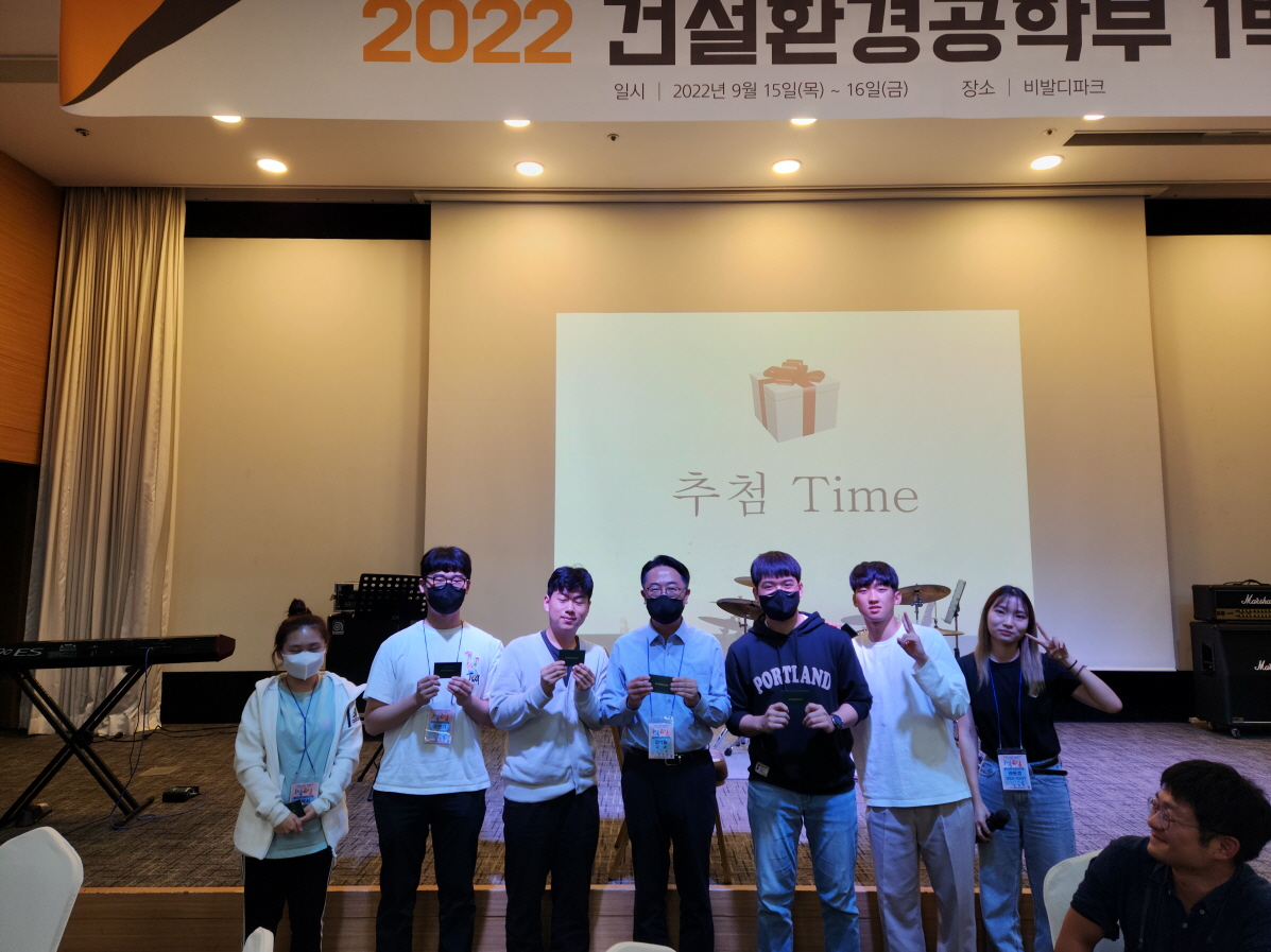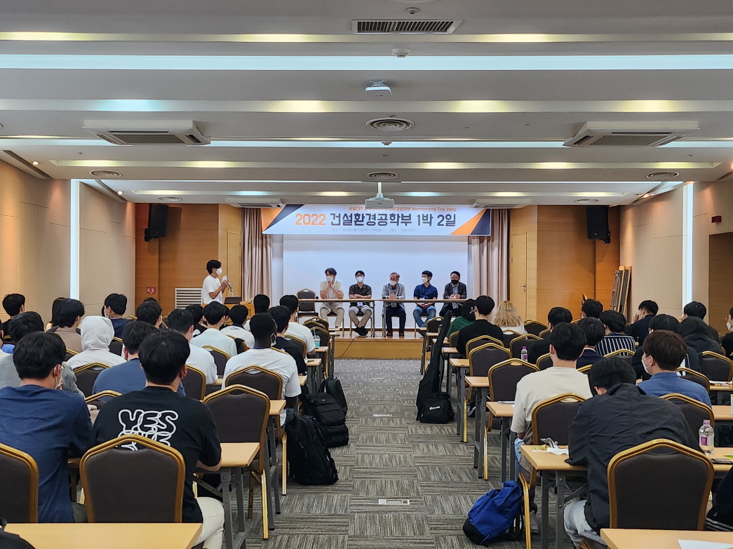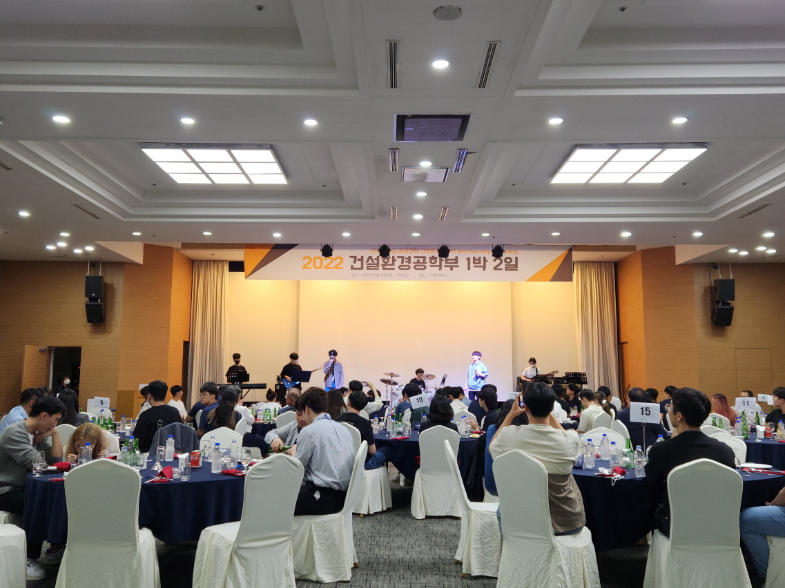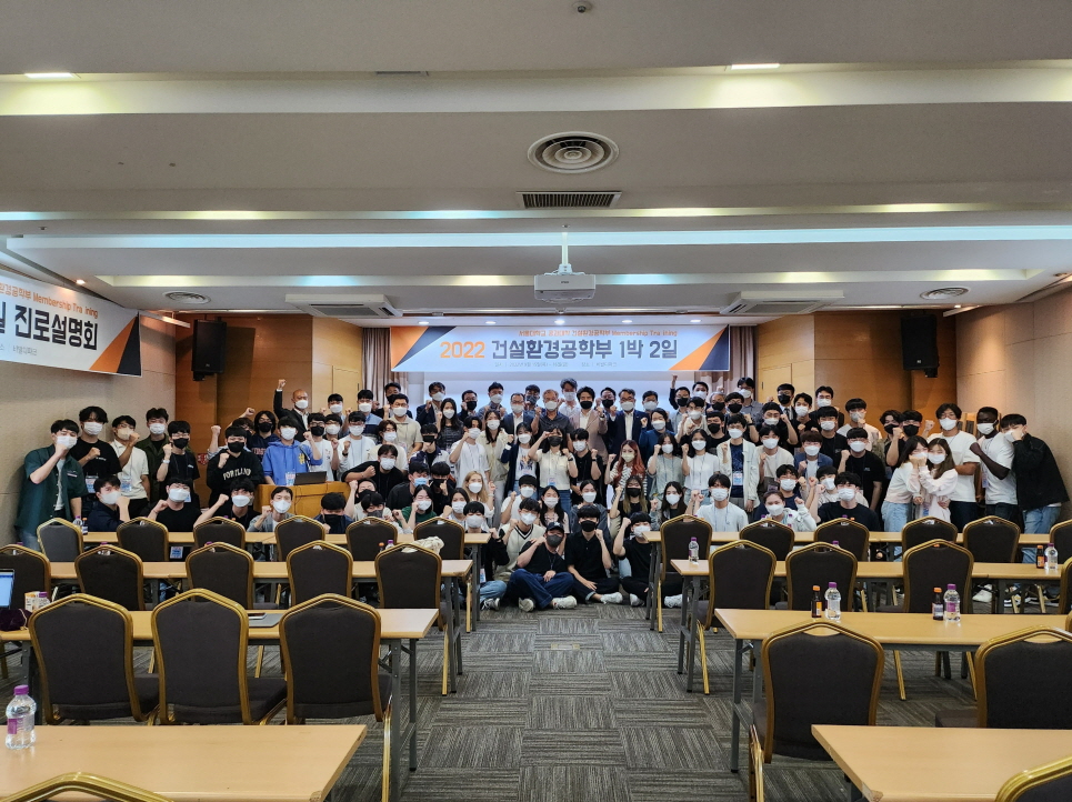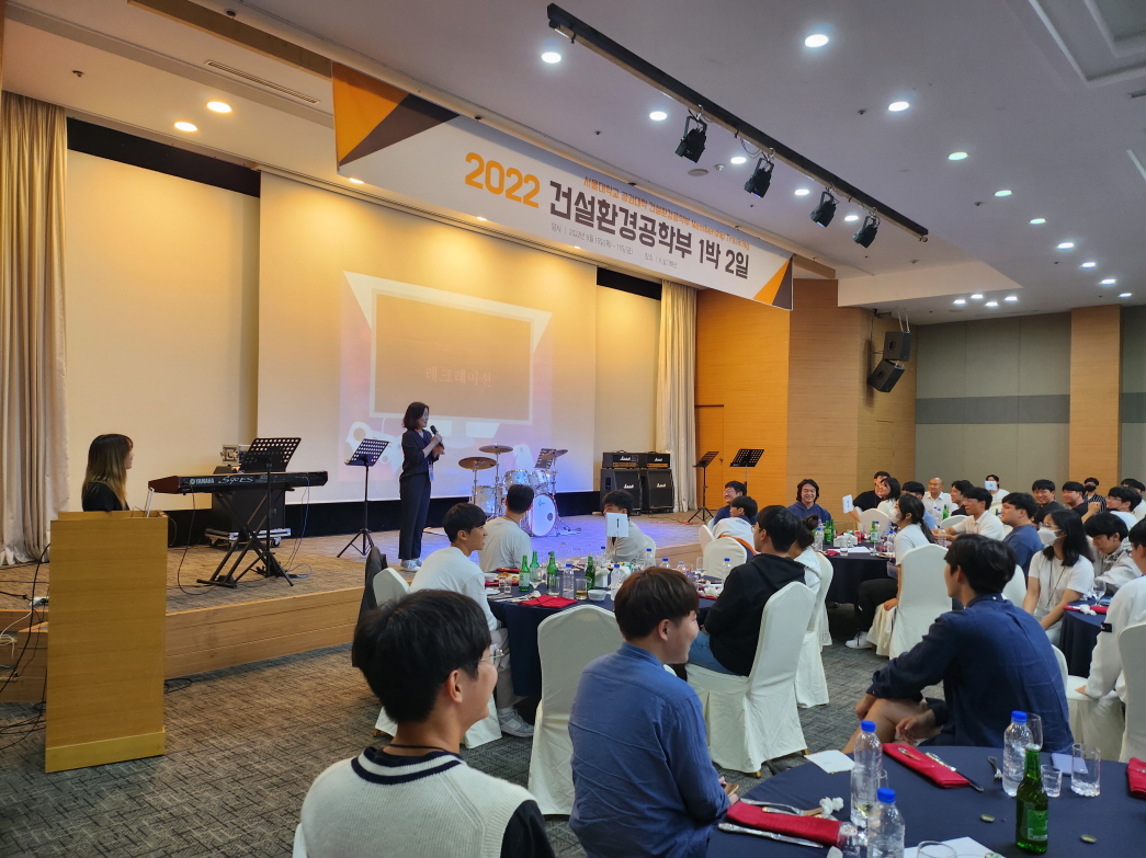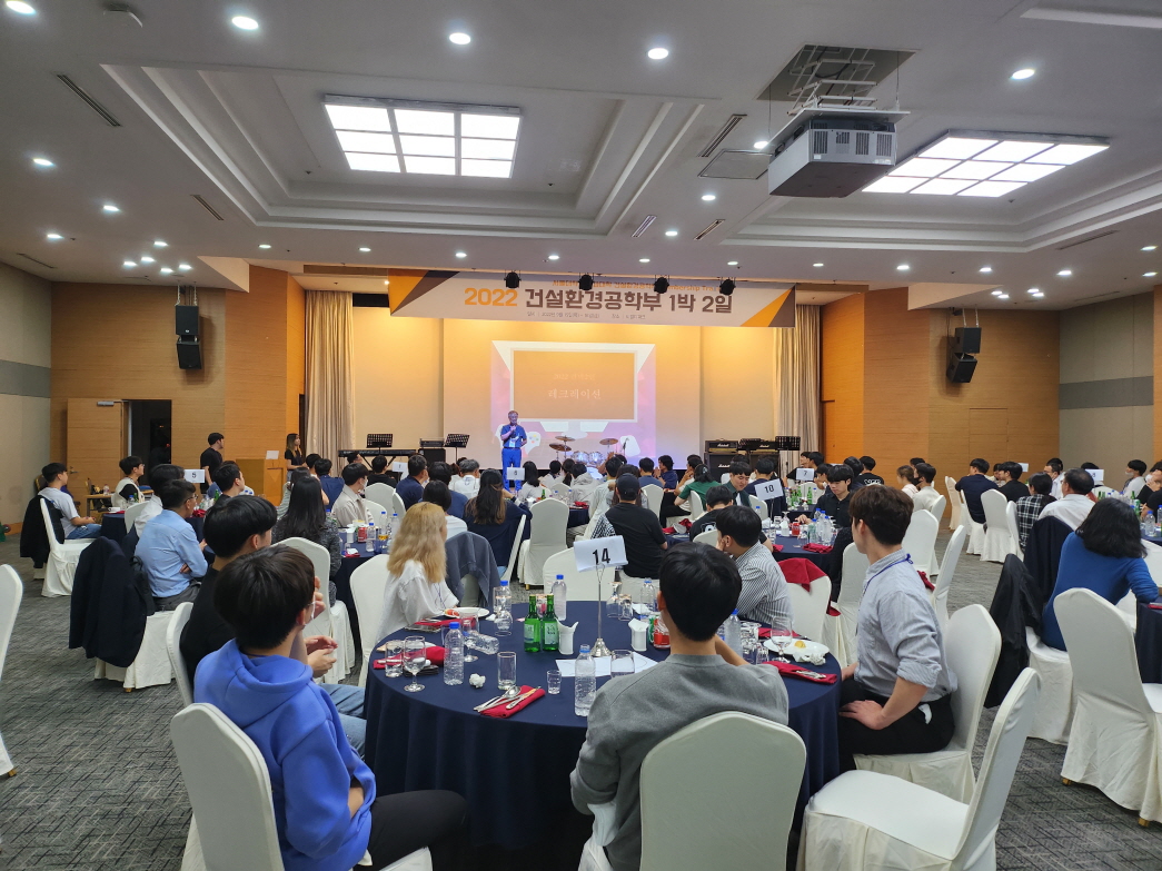 건설환경공학부는 2022. 9. 15.(목) ~ 16.(금) 양일간 강원도 홍천 비발디파크에서 '2022학년도 건설환경공학부 1박 2일'을 개최하였다. 건설환경공학부 학부생, 교수, 직원, 동문 등 120여명이 참여한 동 행사는 교수님과의 대화, 진로 설명회, 단합의 밤 등의 일정으로 진행되었다.