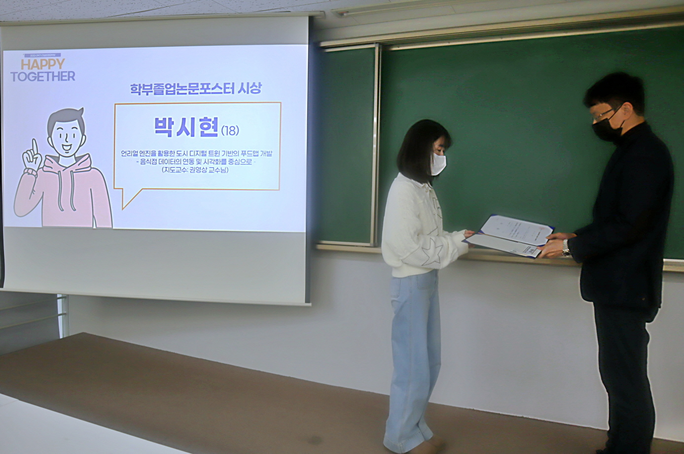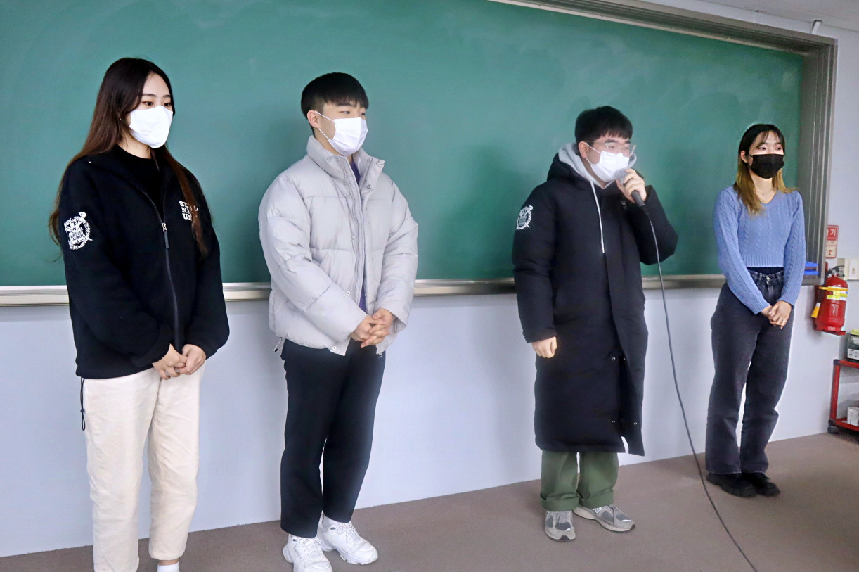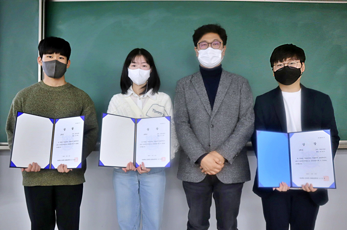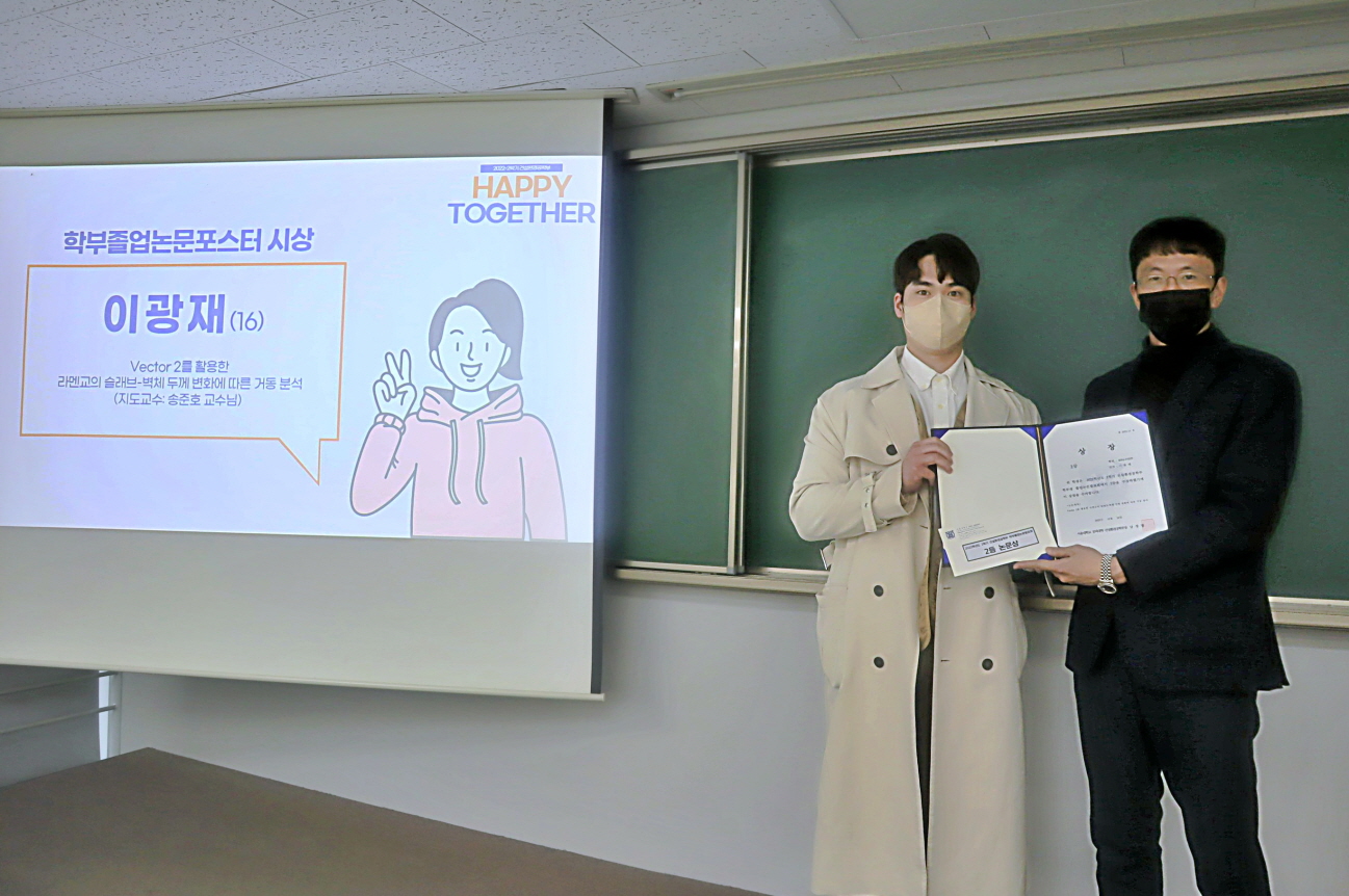 [2022학년도 2학기 건설환경공학부 Happy Together] 12월 14일 오후 4시부터 35동 316호에서 2022학년도 2학기 건환공 Happy Together를 개최하였다. 행사는 권윤경 학생회장의 사회로 남경필 학부장의 인사에 이어 학부졸업논문포스터 시상 및 발표회, 학생포트폴리오 경진대회 시상 및 발표회, 학년별 성적 우수학생 시상, 창의상 경진대회 시상, 신·구임 학생회장단 인사 순서로 진행되었다. 또한, 한 학기동안 진행하였던 7개의 동아리(융, 지오싸카스, 씨너스, 씨리얼, 고시동아리, 시빌헌터스, 외국인학생동아리)의 활동보고가 35동 2층 로비에서 전시되었다.
