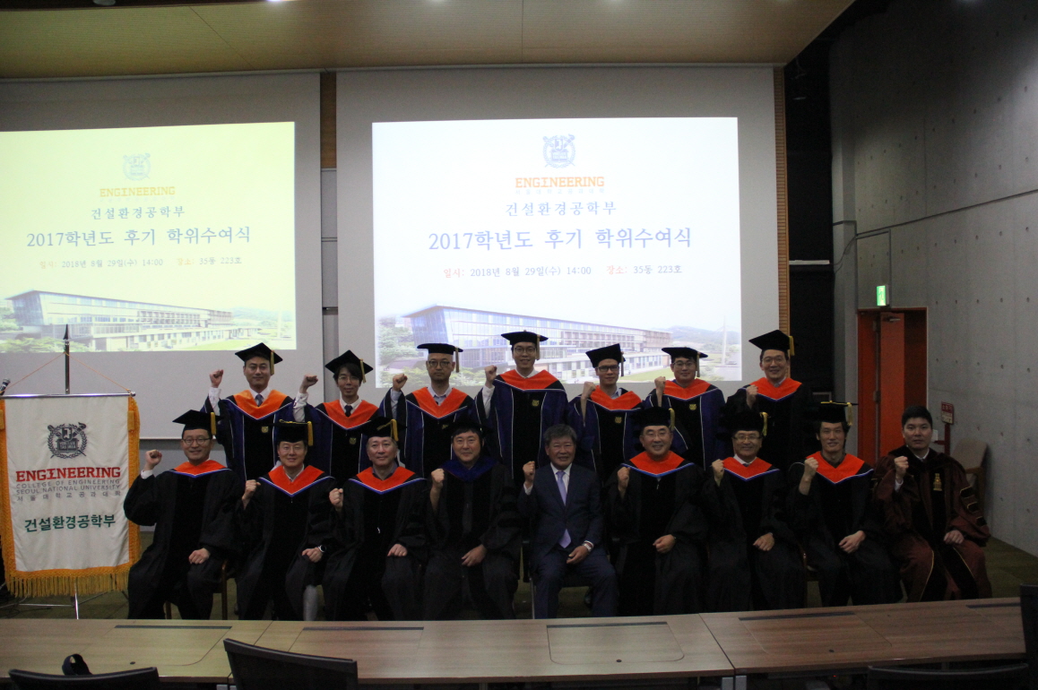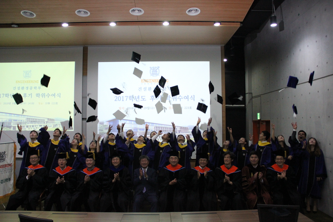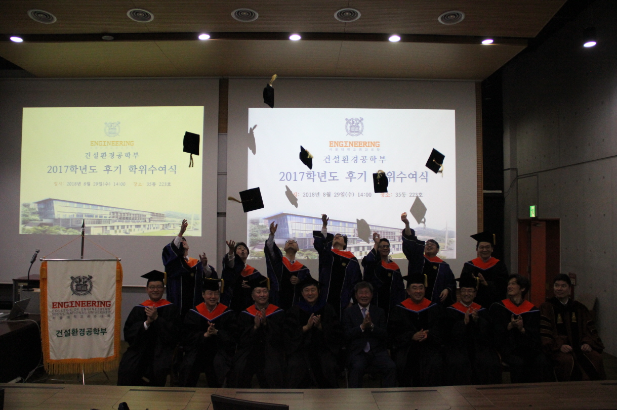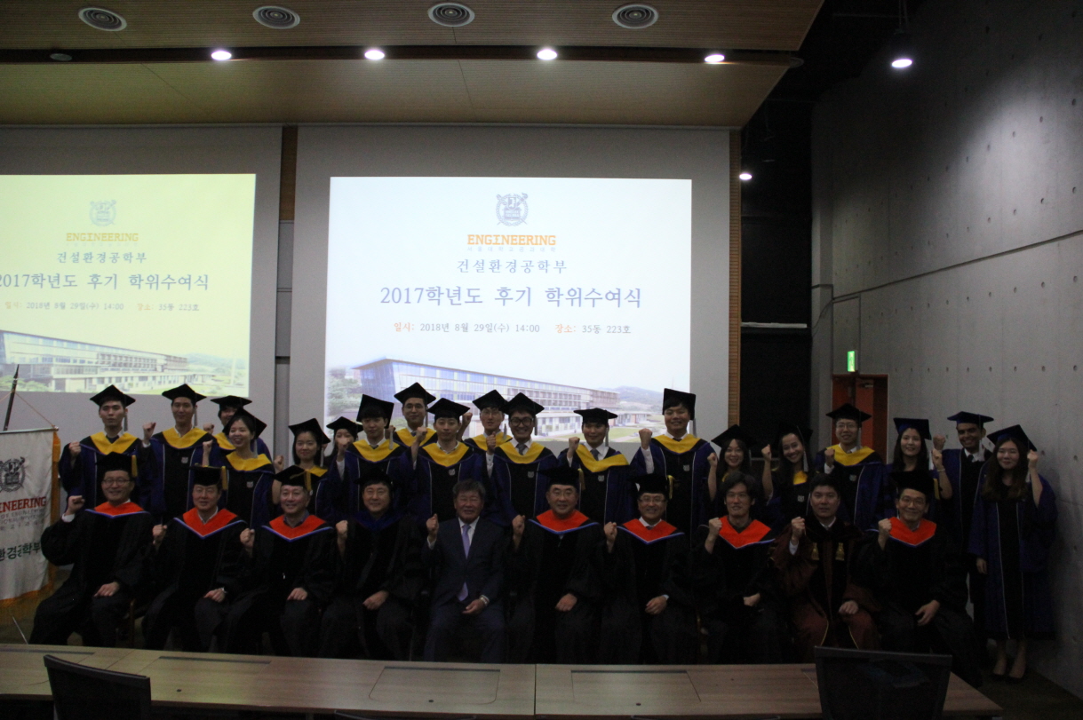 건설환경공학부 2017학년도 후기(2018년 8월) 학위수여식 - 일시: 2018년 8월 29일(수) 14:00-15:00 - 장소: 35동 223호 멀티미디어 강의실 - 대상: 박사 6명, 석사 16명, 학사 4명