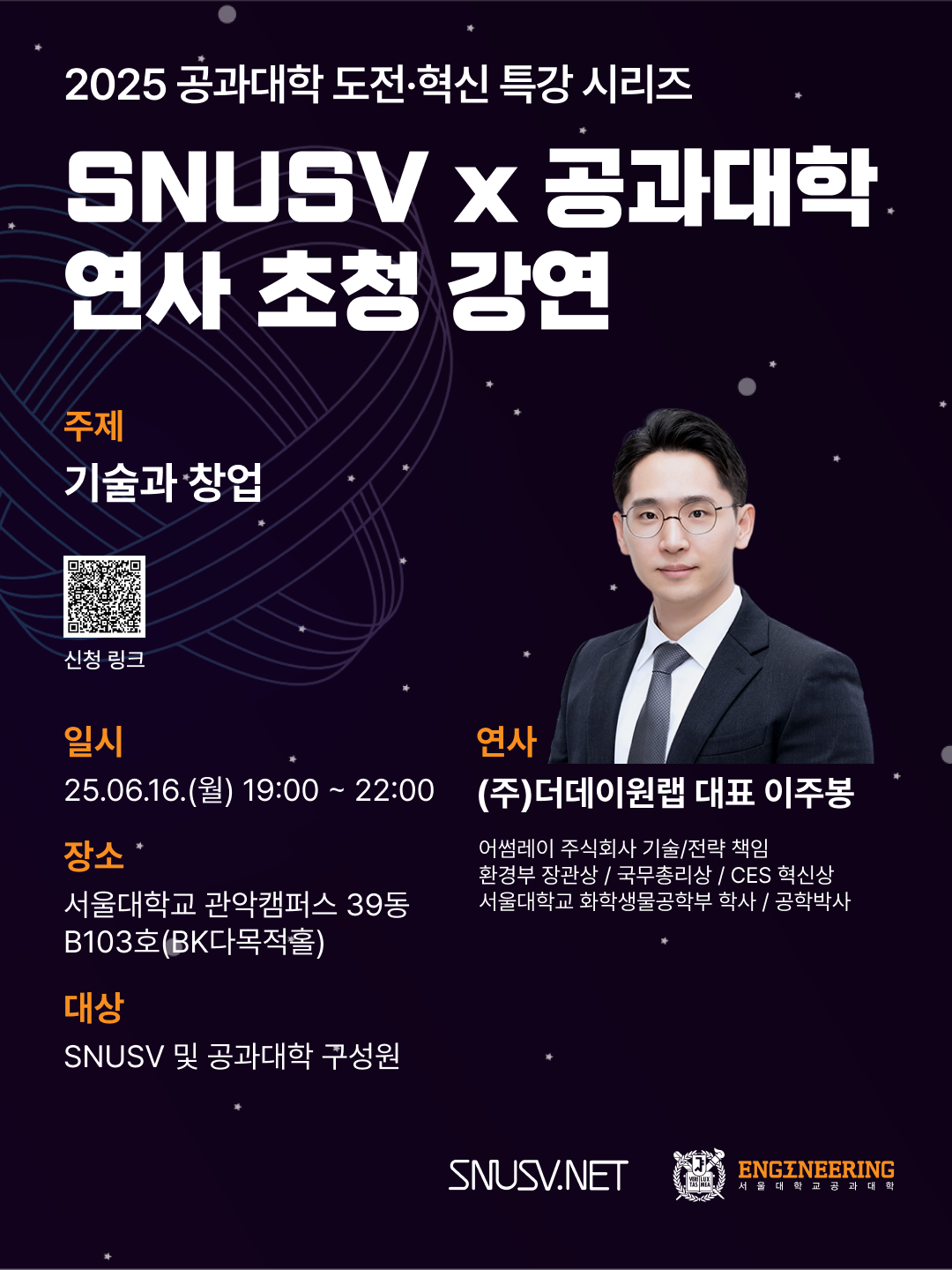 1. 일 시: 2025. 6. 16.(월) 19:00 ~ 22:00 2. 장 소: 39동 B103호(BK다목적홀) 3. 참가인원: 70명(공과대학 학부생, 대학원생) 4. 프로그램: 연사특강, Q&A 및 자유 네트워킹 ※ 간단한 식사 및 다과 제공 - 연사: 이주봉(더데이원랩 대표) 5. 신청방법: 온라인 신청(https://forms.gle/RnhE3ze3pBz23RdH6)
