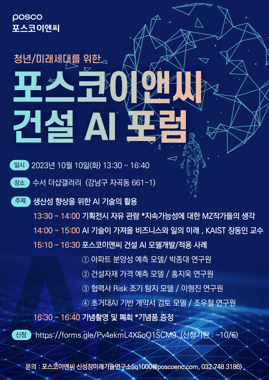 당사가 건설, AI 유관 학부/대학원생들을 대상으로 AI 기술동향과 건설분야 적용사례를 공유하고 참가신청은 아래 링크를 통해 해주시면 됩니다. (신청기한 : ~ 10/6) * 참여신청서 작성 링크 : https://forms.gle/Pv4ekmL4XSoQ1SCM9