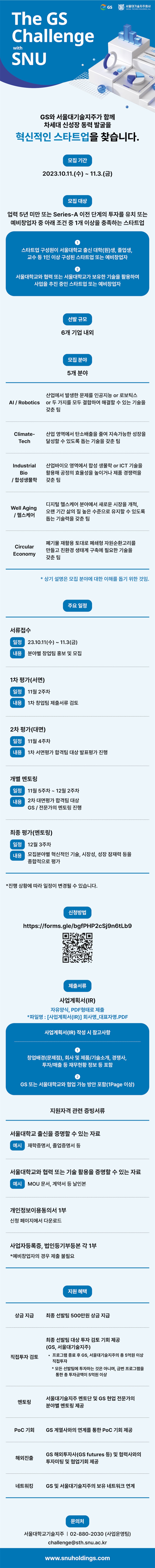 모집기간 : 2023.10.11.(수) ~ 11.3.(금) 선발 규모 : 6개 기업 내외 모집 분야 : 5개 분아(AI / Robotics, Climate-Tech, Industrial Bio, Well Aging, Circular Economy) 지원 혜택 : 상급지급, 직접투자 검토, 멘토링, PoC 기회 제공, 해외진출, 네트워킹 신청 방법 : 구글폼(https://forms.gle/bgfPHP2cSj9n6tLb9)을 통한 지원