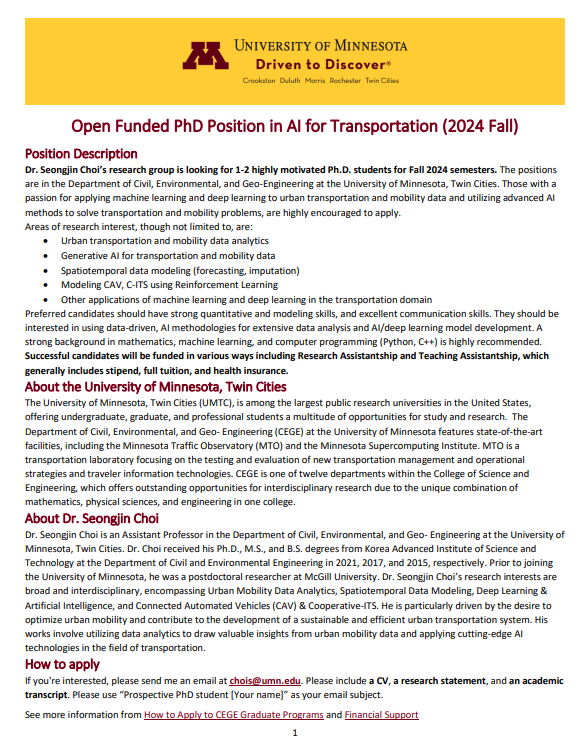 University of Minnesota의 최성진 교수님 연구 그룹에서 2024년 9월 입학이 가능한 Ph. D. 학생을 선발 중이오니, 관심있는 학생분들은 적극적으로 참여 부탁드립니다.