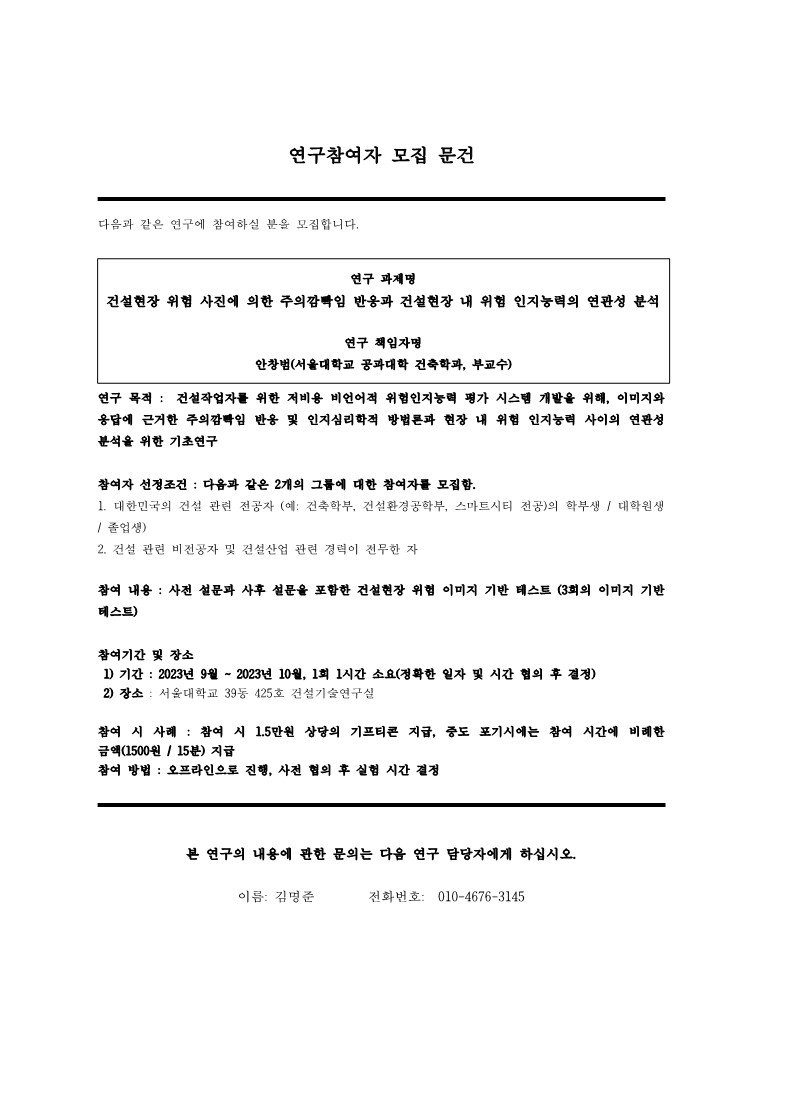 [기타] 건축학과 건설기술연구실 연구참여자 모집 안내(참여 시 기프티콘 증정)