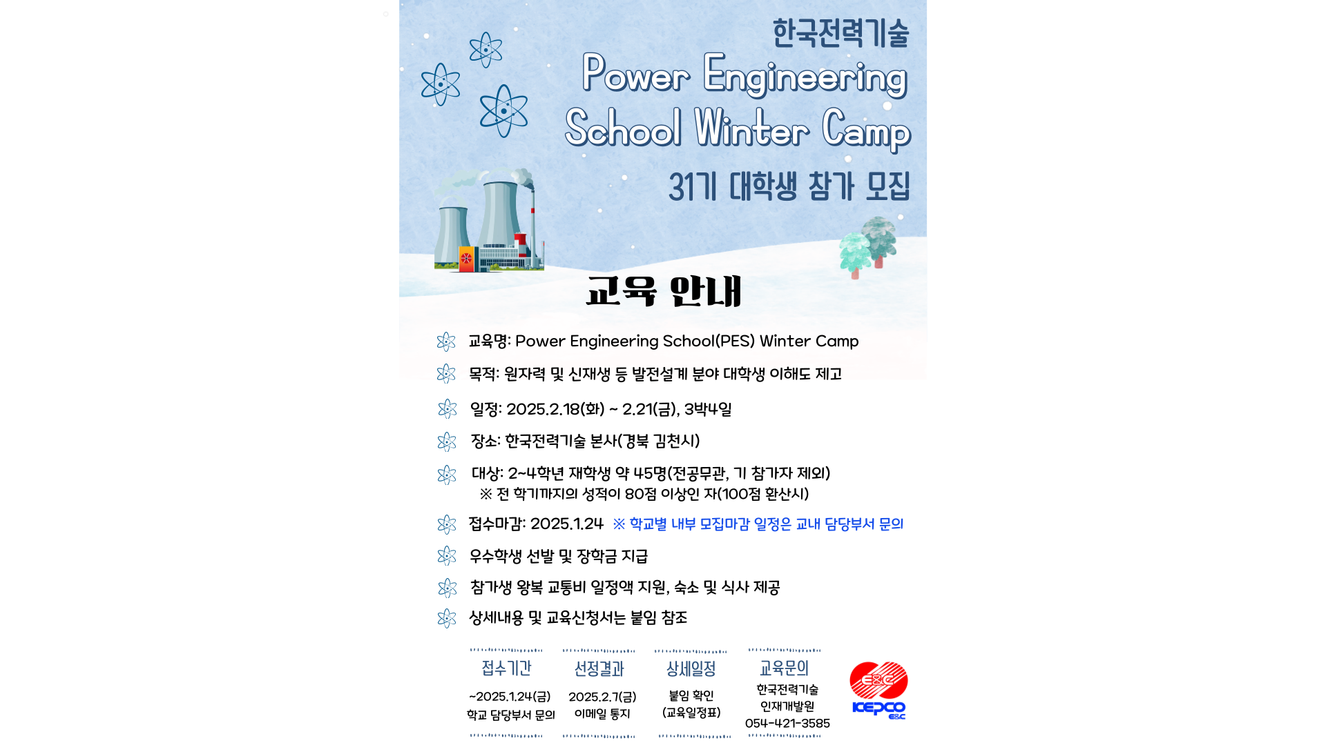한국전력기술(주) 인재개발원에서 「Power Engineering School(PES) Winter Camp(31기)」 참가자를 모집하고 있습니다. 관심있는 학생들은 첨부를 참고 바랍니다. 1. 교육명: 2025년 Power Engineering School(PES) Winter Camp 31기 2. 목적: 원자력/신재생/복합화력 등 발전설계 분야 기초교육을 제공하여 국내발전 산업에 대한 대학생 이해도 증진 3. 교육개요 - 교육기간: 2025.2.18(화) ~ 2.21(금), 3박4일 - 교육장소: 한국전력기술 본사(경북 김천시) - 교육인원: 약 45명 - 교육과목: 원자력발전설계 및 신재생/복합화력발전 설계 등(붙임2 일정표 참조)