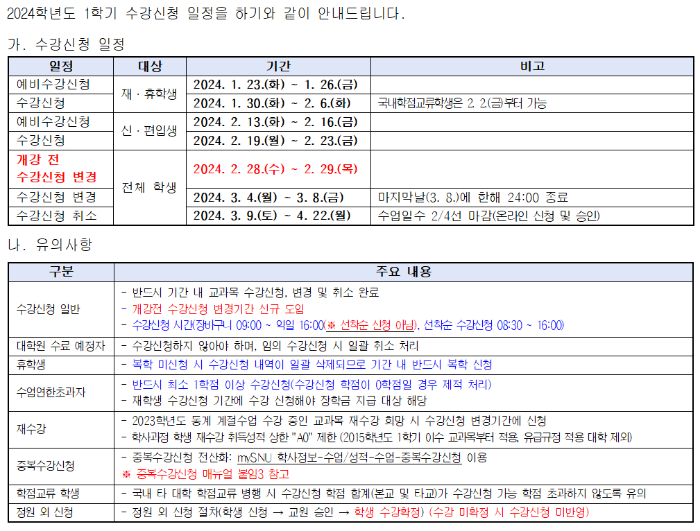 붙임 1. 수강신청 안내문 및 수강신청 매뉴얼 각 1부