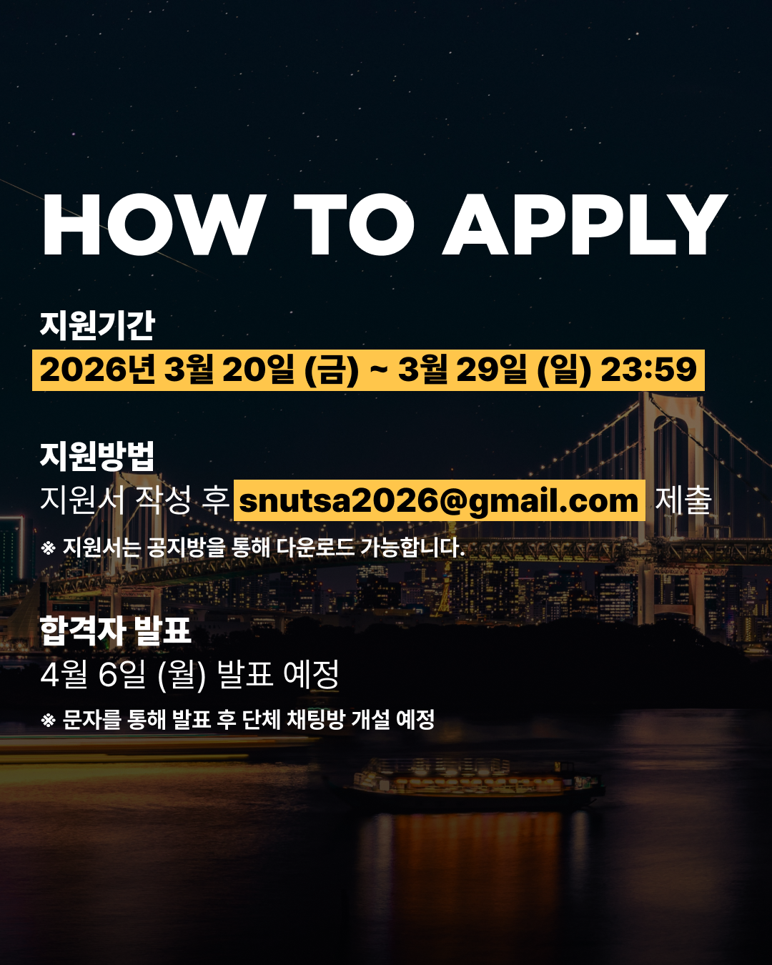 지원방법: 첨부된 지원서 작성 후 snutsa2026@gmail.com 으로 제출