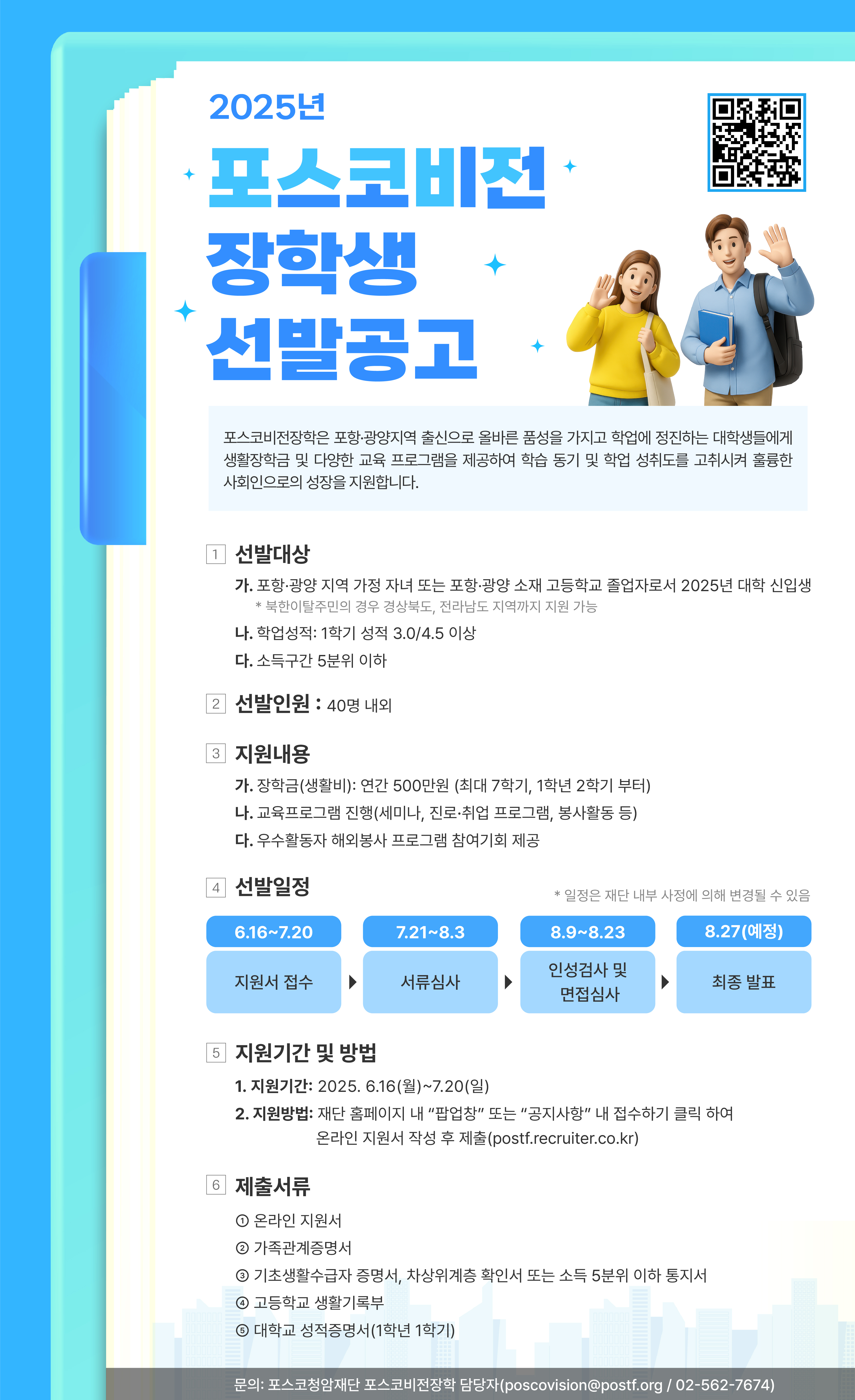 포스코청암재단은 ▲ 포스코청암상 ▲ 국내의 과학기술 인재를 세계적 수준으로 육성하는 포스코사이언스펠로십 ▲ 아시아의 상호 이해와 공동번영을 위한 포스코아시아펠로십 ▲ 교육기회 불균형 해소를 위한 포스코유스펠로십을 핵심사업으로 운영하고 있습니다. 이중 포스코유스펠로십 사업의 일환으로 운영하는 <포스코비전장학> 프로그램은 제철소가 소재한 포항,광양지역 출신 청소년과 경상북도, 전라남도 북한배경청소년이 꿈과 비전을 갖고 학업에 전념할 수 있도록 생활비와 다양한 교육프로그램을 지원하는 장학사업입니다. (대학 졸업시까지/최대 7학기)