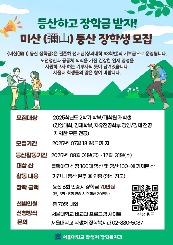 <미산(彌山) 등산 장학금>은 권준하 선배님(상과대학 63학번)의 기부금으로 운영됩니다. 도전정신과 공동체 의식을 가진 건강한 인재 양성을 지원하고자 하는 기부자의 뜻이 담겨있습니다. 서울대 학생들의 많은 참여 바랍니다.>