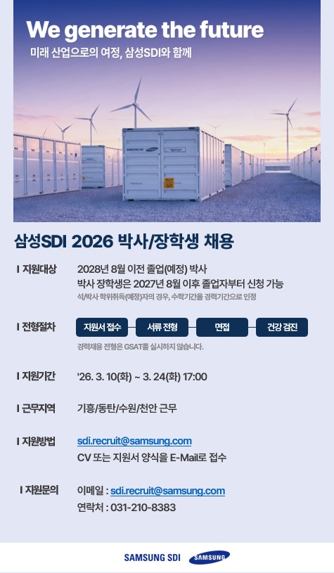 안녕하세요, 삼성SDI People팀입니다. 삼성SDI와 함께 밝은 미래를 열어갈 여러분을 기다리겠습니다. 아래 참고하시어 많은 관심과 지원바랍니다. ■ 지원 기간 : '26.03.10(화) ~ '26.03.24(화) 17:00 ■ 지원 대상 : 박사/Post Doc. 2028년 8월 이전 졸업(예정) 박사 박사 장학생은 2027년 8월 이후 졸업자부터 신청 가능 ■ 지원 방법 : CV 또는 지원서 양식을 e-mail로 접수 (sdi.recruit@samsung.com) [ Job Description ] 첨부 Job Description 참고해주시기 바랍니다. ※ 삼성 커리어스 - https://www.samsungcareers.com/subsid/detail/C31 기타 문의사항은 아래 메일 주소로 언제든 편하게 연락주세요. ※ 문의처 : sdi.recruit@samsung.com 감사합니다.